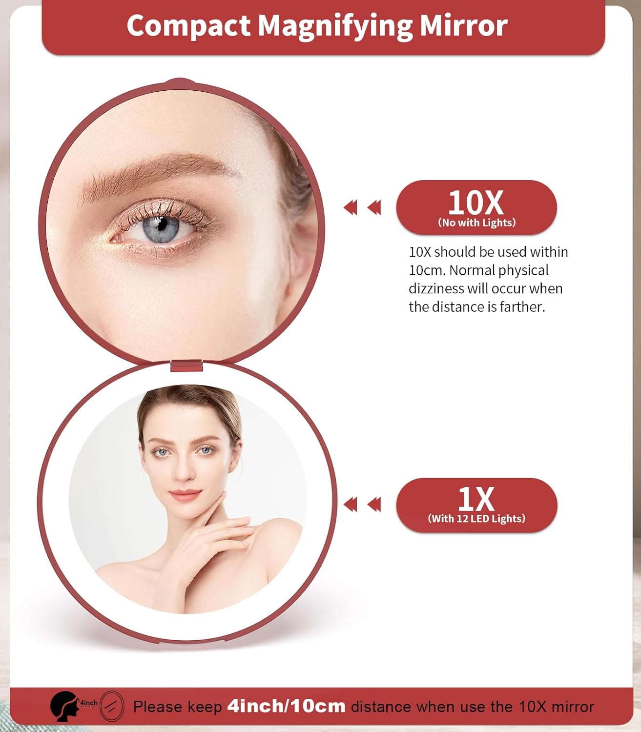 • 10x Magnifying:10x compact magnifying mirror, better magnification of facial details,which is good for makeup needs, shaving, or deep cleaning.Tip: When using the 10x magnifying mirror, please keep a distance of less than 10 cm, otherwise it may cause normal dizziness and affect imaging