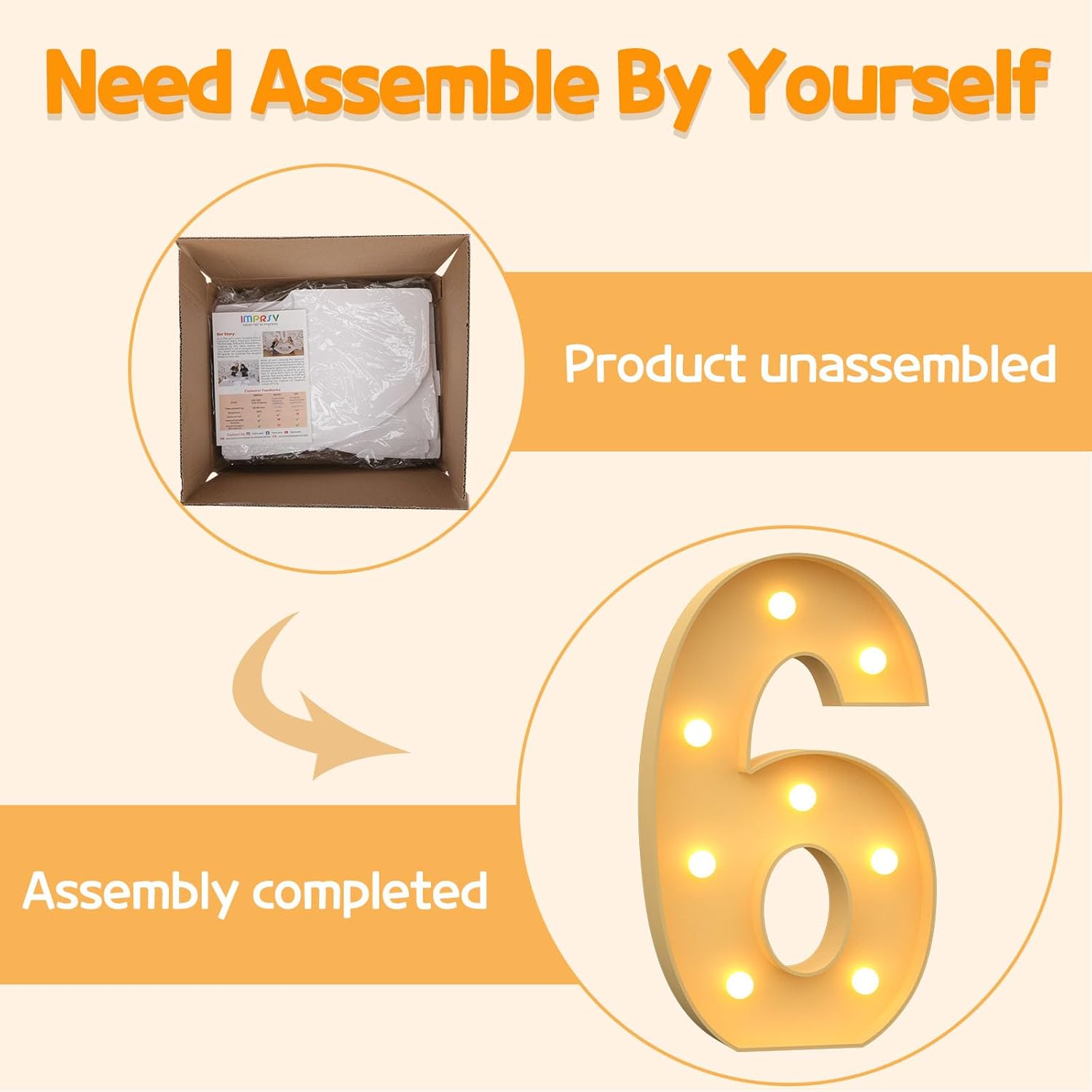• Assembly Required: Our large marquee numbers is made from foam board and easy to assemble with our splicing mode. Just follow the numbered instructions to align and insert the bottom plate, and reinforce it with a hot glue gun. Then, you're done!