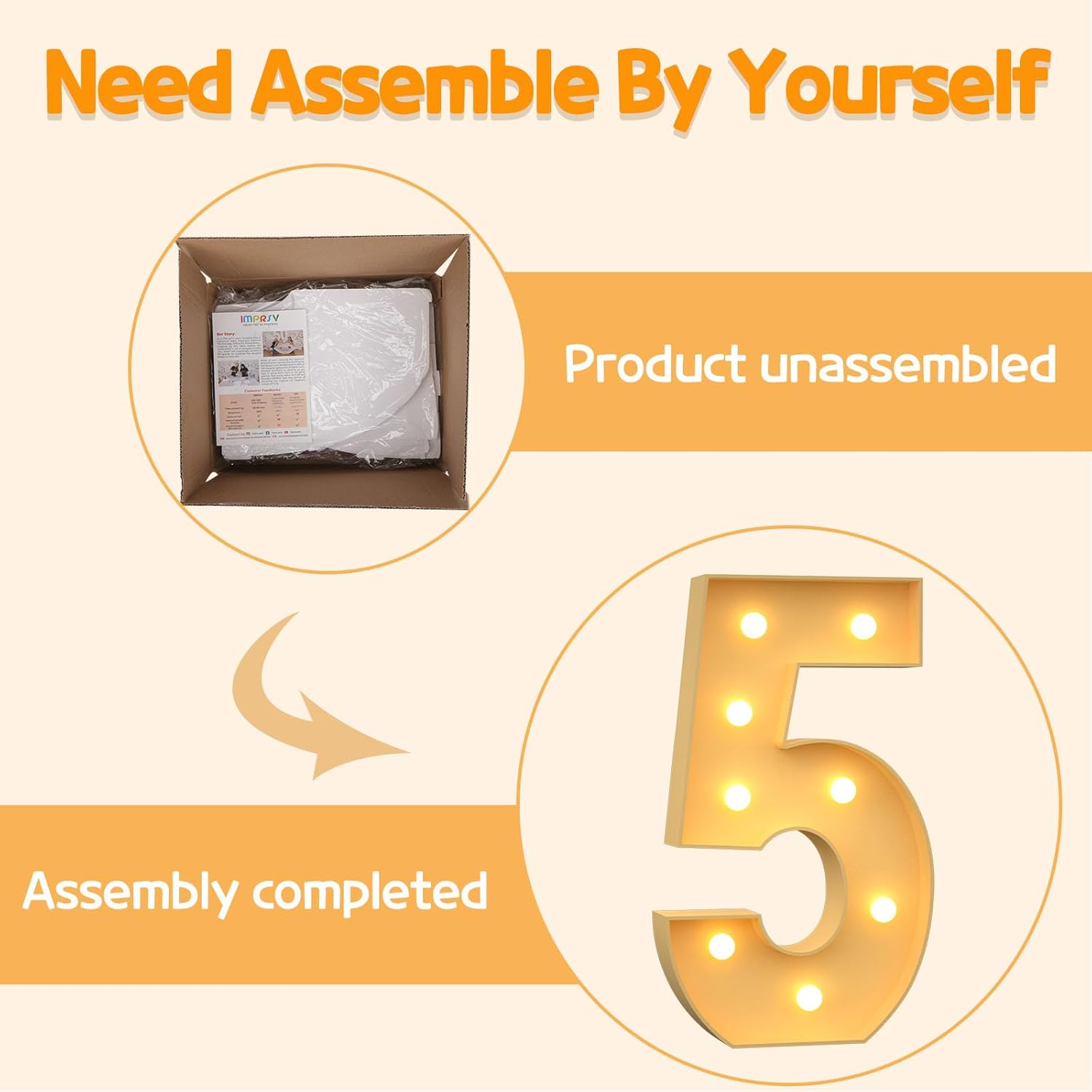 • Assembly Required: Our large marquee numbers is made from foam board and easy to assemble with our splicing mode. Just follow the numbered instructions to align and insert the bottom plate, and reinforce it with a hot glue gun. Then, you're done!