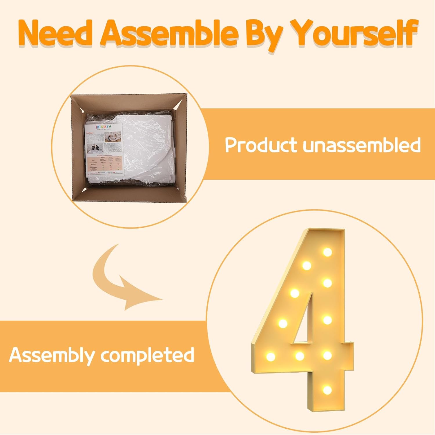 • Assembly Required: Our large marquee numbers is made from foam board and easy to assemble with our splicing mode. Just follow the numbered instructions to align and insert the bottom plate, and reinforce it with a hot glue gun. Then, you're done!