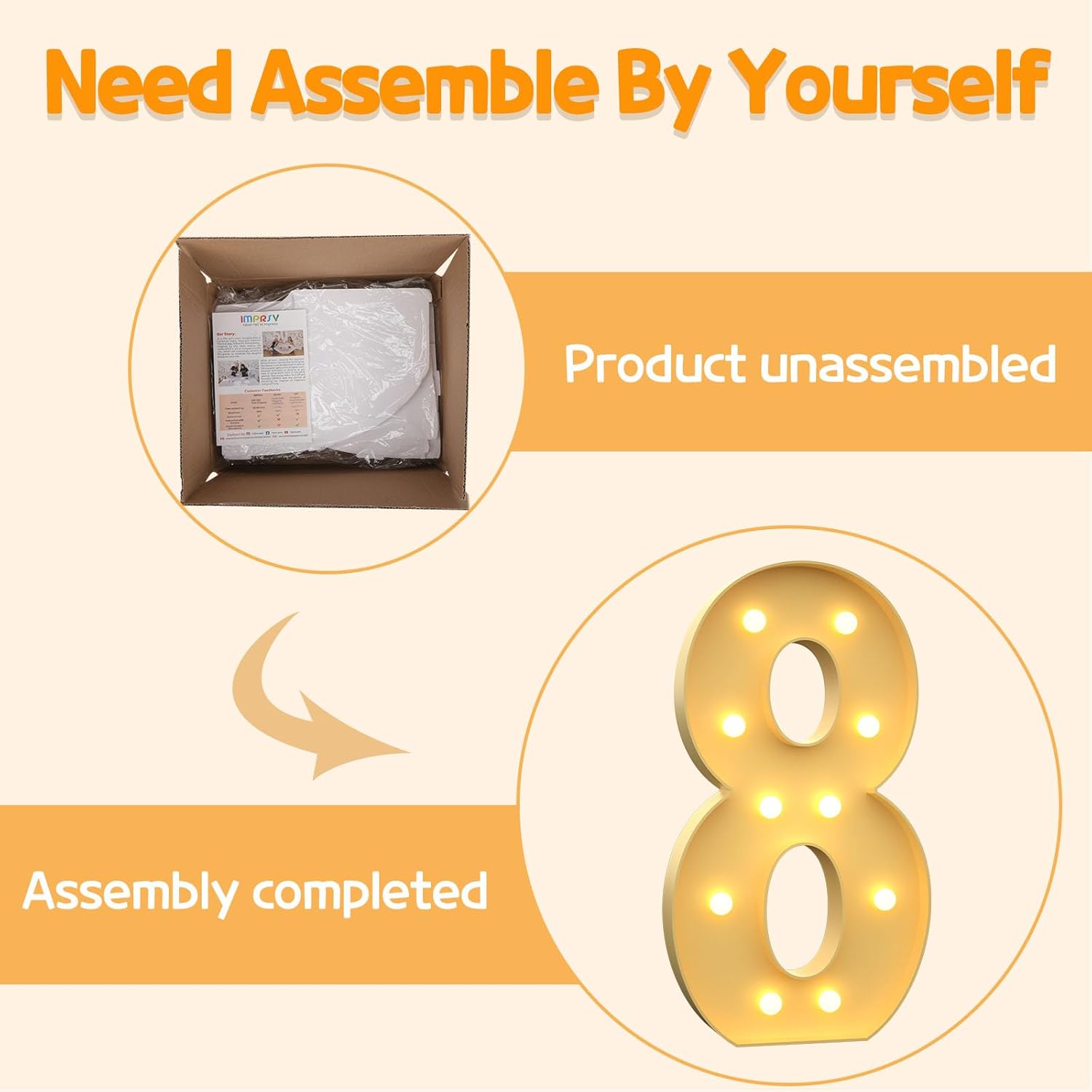 • Assembly Required: Our large marquee numbers is made from foam board and easy to assemble with our splicing mode. Just follow the numbered instructions to align and insert the bottom plate, and reinforce it with a hot glue gun. Then, you're done!