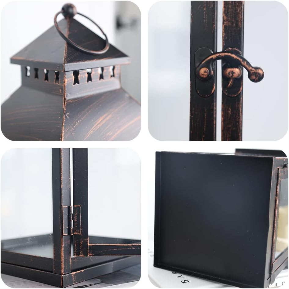 • Suitable for Most Outdoor Scenes——The set of 2 Large Bronze vintage candle lantern is perfect for outdoor use. The metal material can withstand wind and rain, while the high-quality glass prevents rainwater from getting in and allows you to see the bright, flickering candles, creating a fantastic atmosphere.