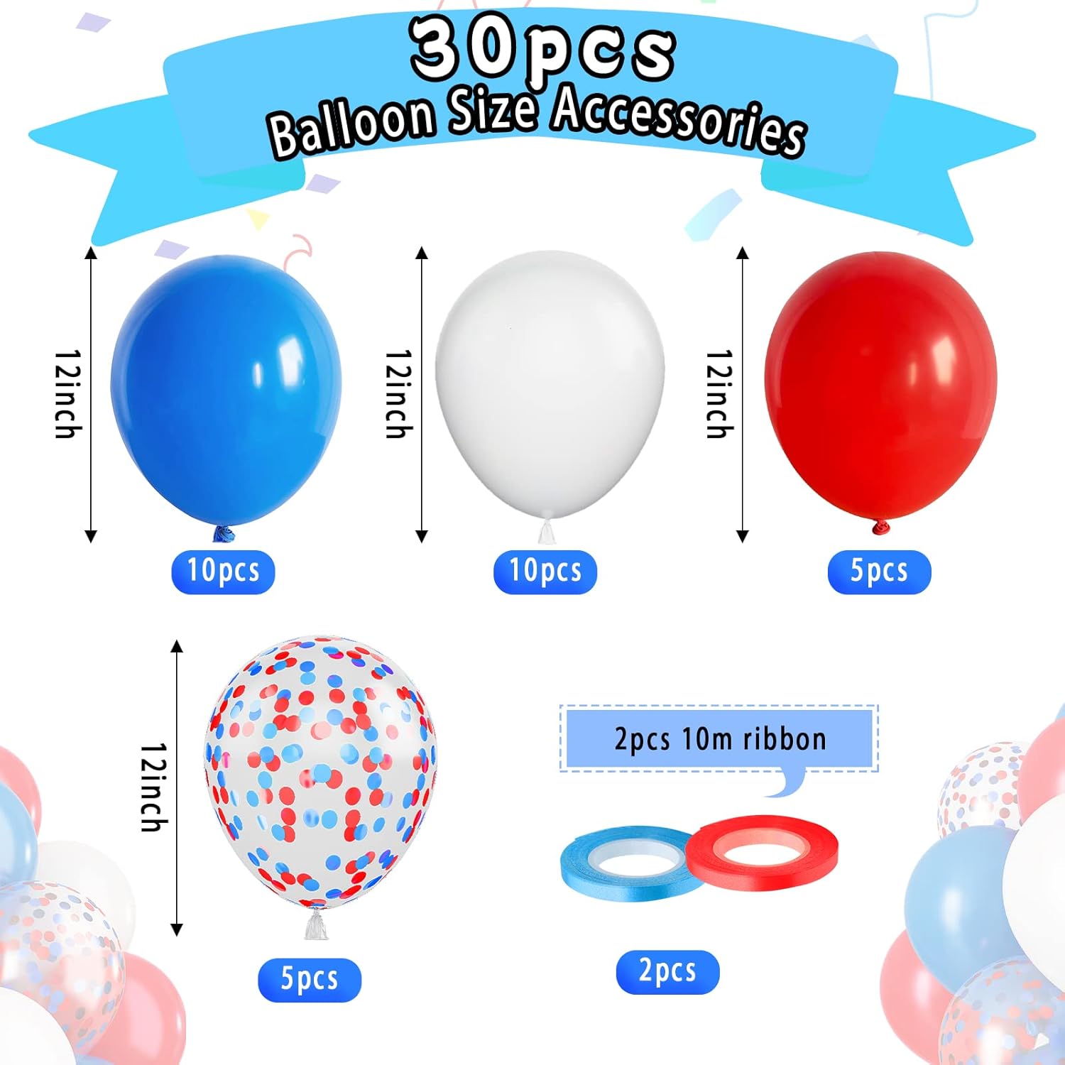 • Mixed Balloons Set: The 12 inch blue and red confetti balloons set includes 10pcs matte navy blue balloons, 7pcs matte red balloons, 8pcs matte white balloons, 5pcs blue and red confetti balloons, 2 roll of ribbon. 32pcs in total. Vibrant colors give you a impressive party and make some unforgettable fond memories.