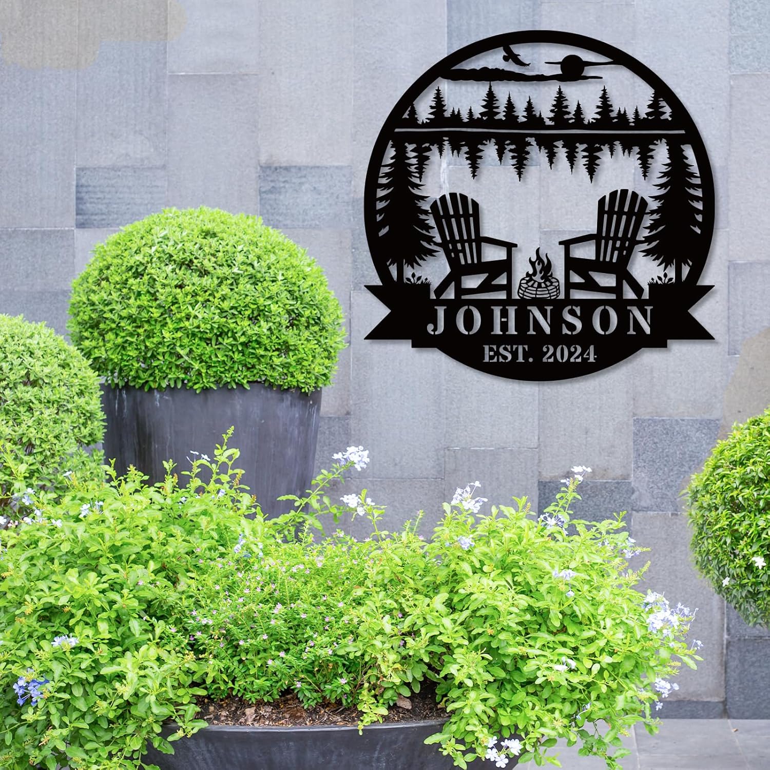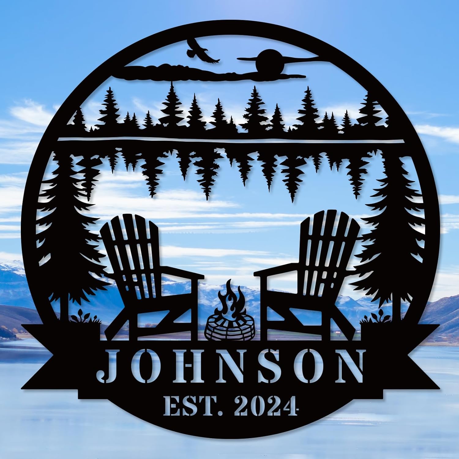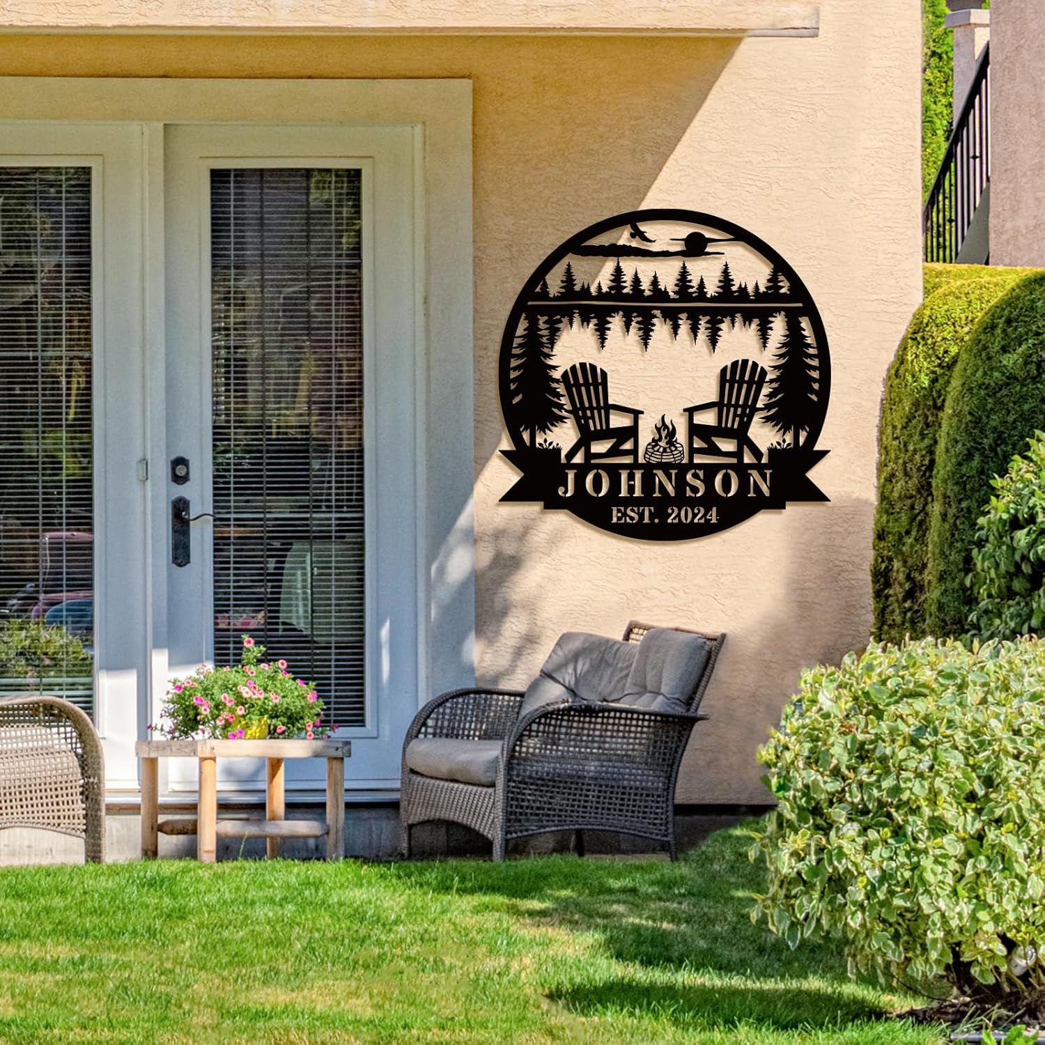 Custom Campfire Metal Name Sign, Campsite Custom Metal Family Name Sign, Campsite Monogram Forest, Personalized Camping Gifts Fire Pit Camper Lover Gift
