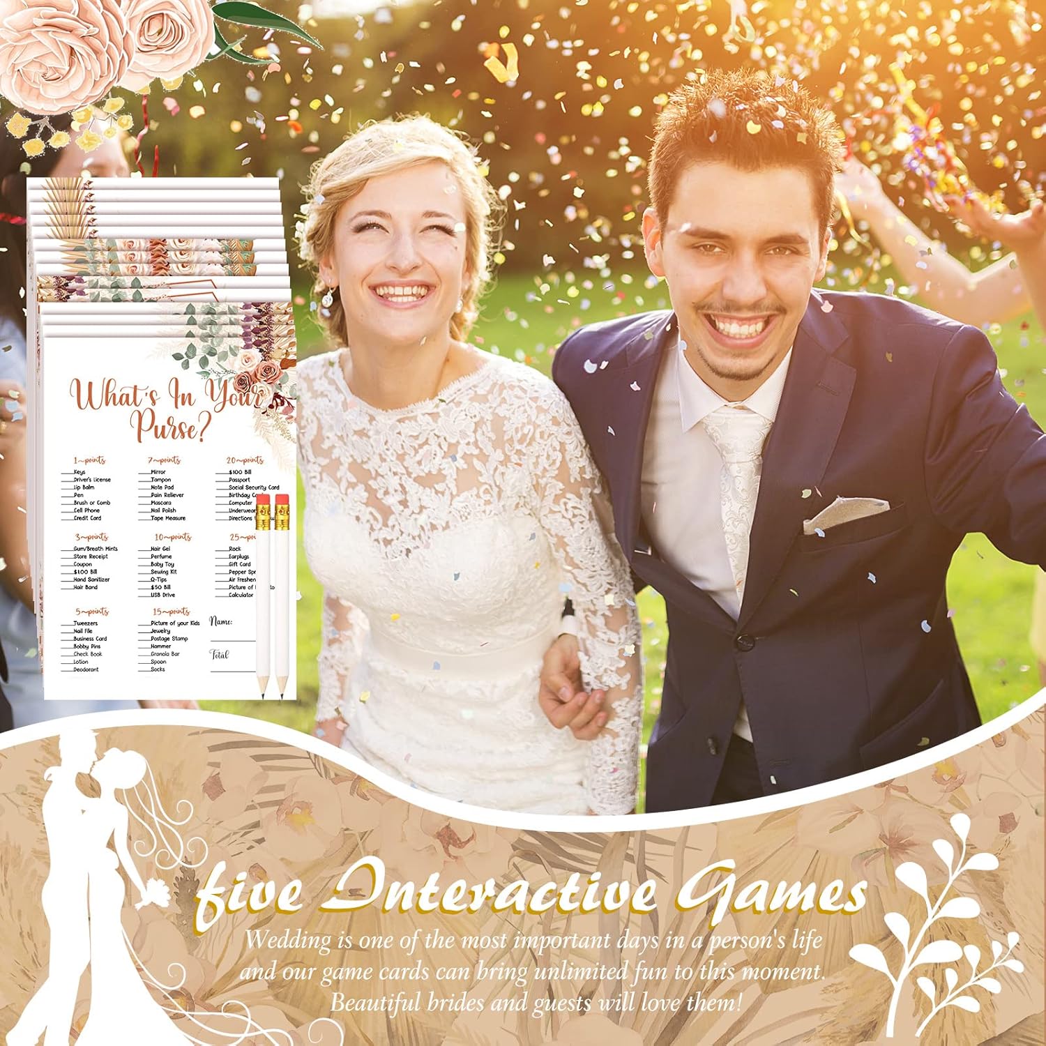 • 5 Styles of Fun Bridal Shower Games: our game bridal shower cards contain 5 fun games, including "Would She Rather", "Bride Or Groom Guess Who", "Bridal Word Scramble", "Wishes For The Bride And Groom", "What's In Your Purse"; These cards provide your guests with a fun wedding game to help them fully enjoy the party and elevate the mood