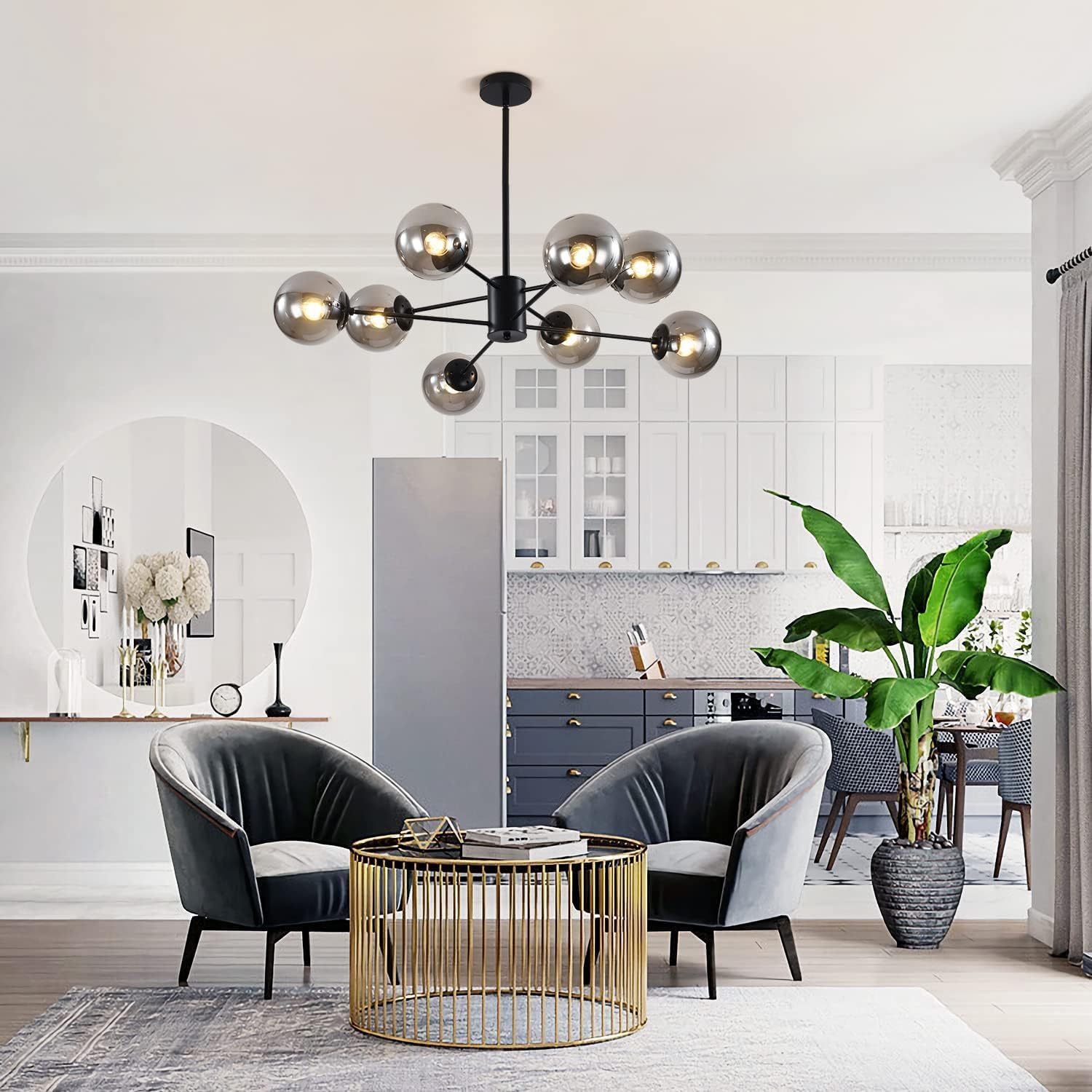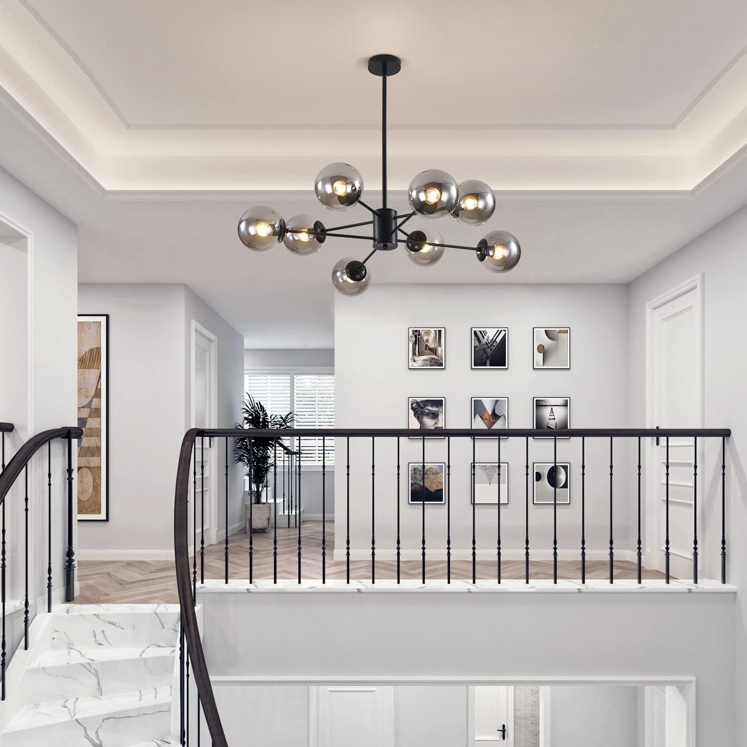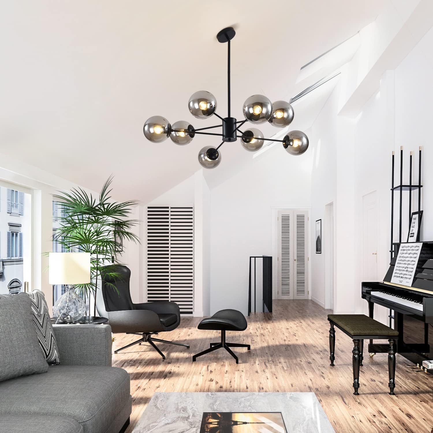 • Mid Century Modern Sputnik Chandelier: The smoke grey glass globe lampshade diffuse the light to create a welcoming glow. Matte black together with smoke grey, the whole light fixture is smooth lines, good texture. When it turn on, the lighting will reflect through the glass, adding a romantic, fancy and shining atmosphere to your room