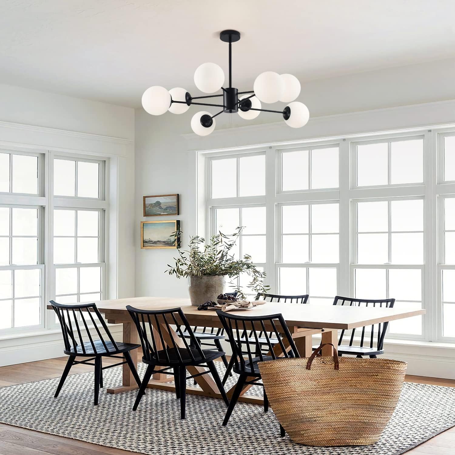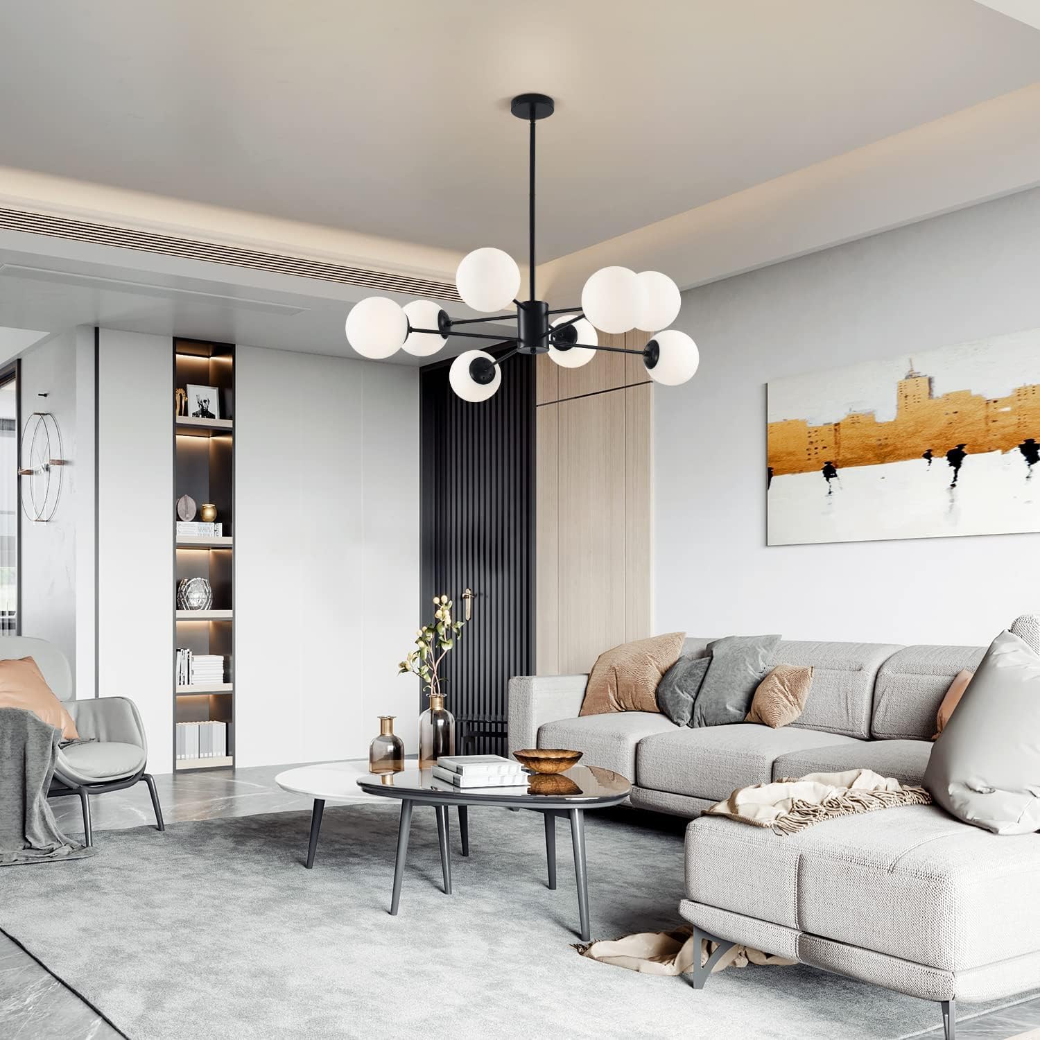 • Mid Century Modern Sputnik Chandelier: The globe chandelier light arm extend out from the center post, milk white glass globe lampshade diffuse the light to create a welcoming glow. Matte black together with frosted white, the whole light fixture is smooth lines, good texture. When it turn on, the lighting will reflect through the glass, adding a romantic, fancy and shining atmosphere to your room