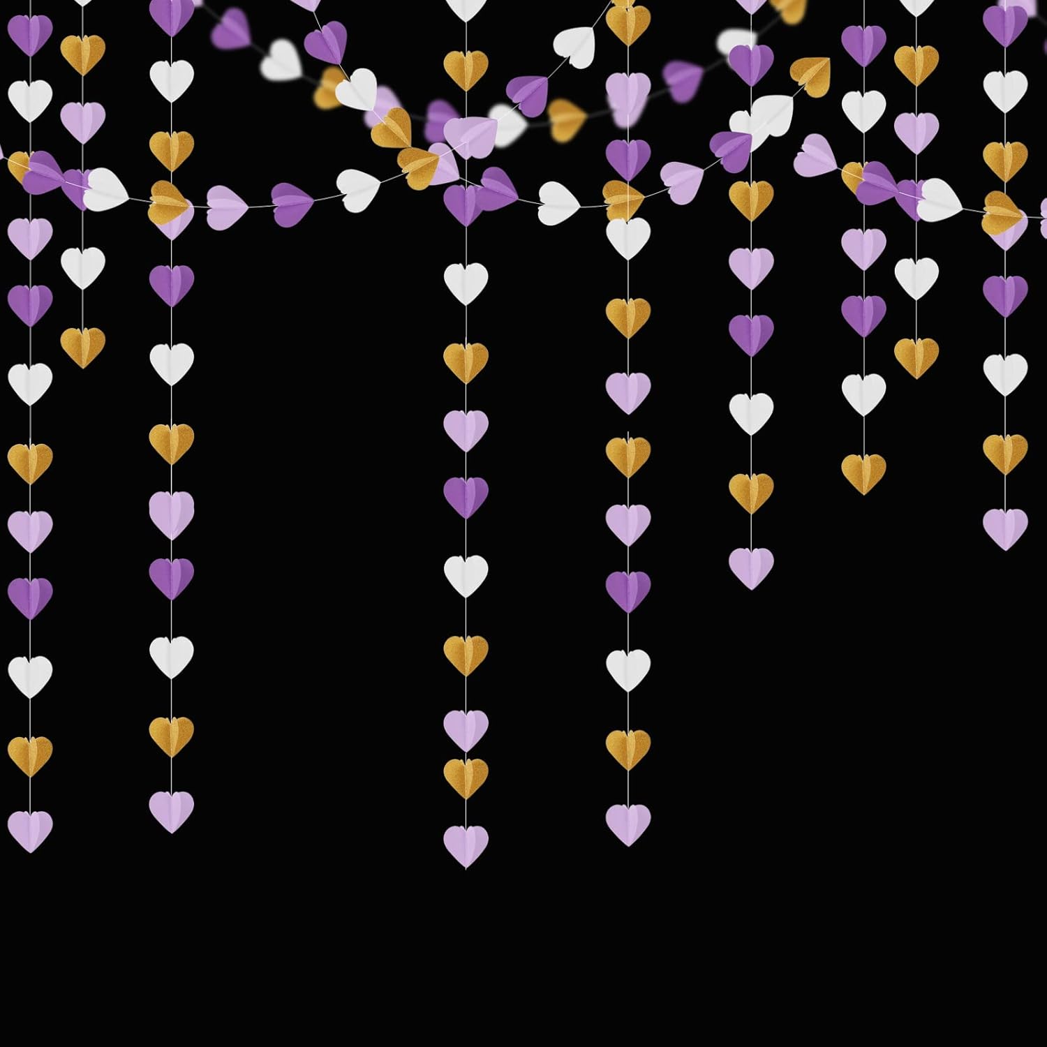 Purple-Gold Party-Decorations 3D Heart Garland - 39Ft White Purple Lavender Graduation Hanging Paper Streamers Banner, Women Birthday Wedding Engagement Baby Bridal Shower Decor Ouruola