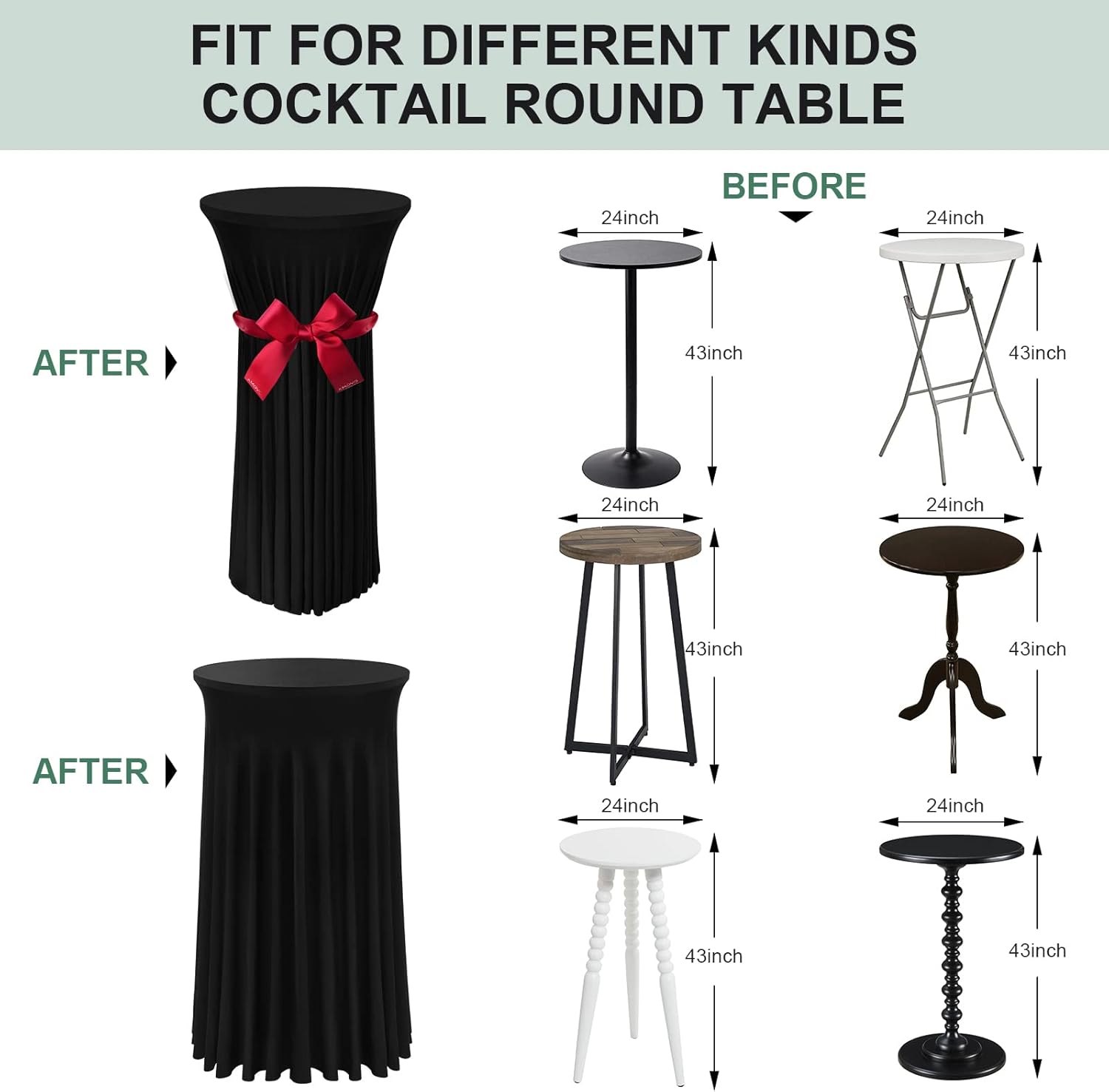 • Skirt Design - These are uniquely designed cocktail table covers that fit any tall round table with a diameter of approximately 24 inches and a height of approximately 43 inches, whether the bottom is an X style or a single center column