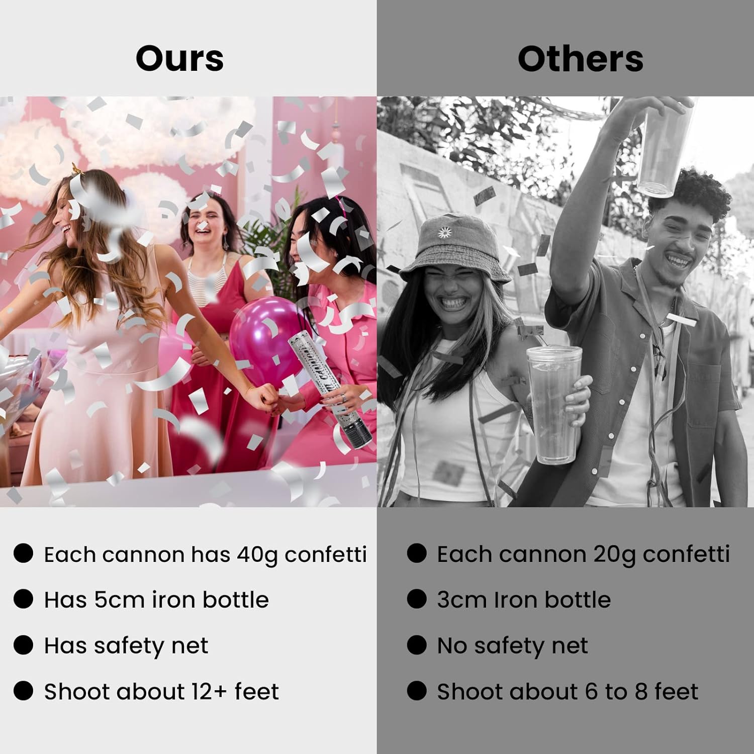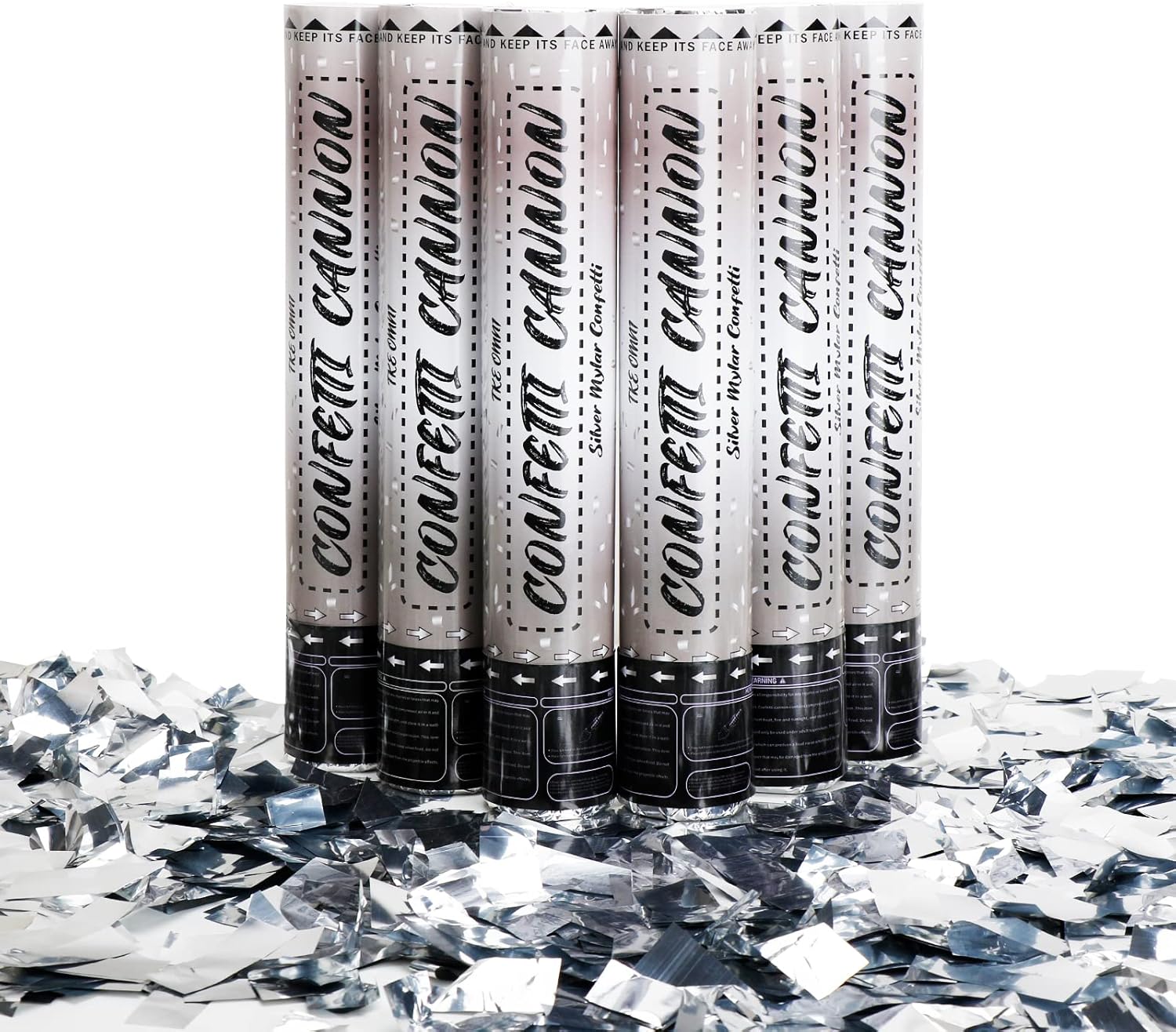 • πŸŽ‰ Mega-Value Confetti Cannons: We offer you a set of premium confetti poppers at a price that won't break the bank. Each large confetti cannon is 12 x 2 inches (30 x 5cm), filled with exciting confetti made of fireproof and non-fade silver mylar!