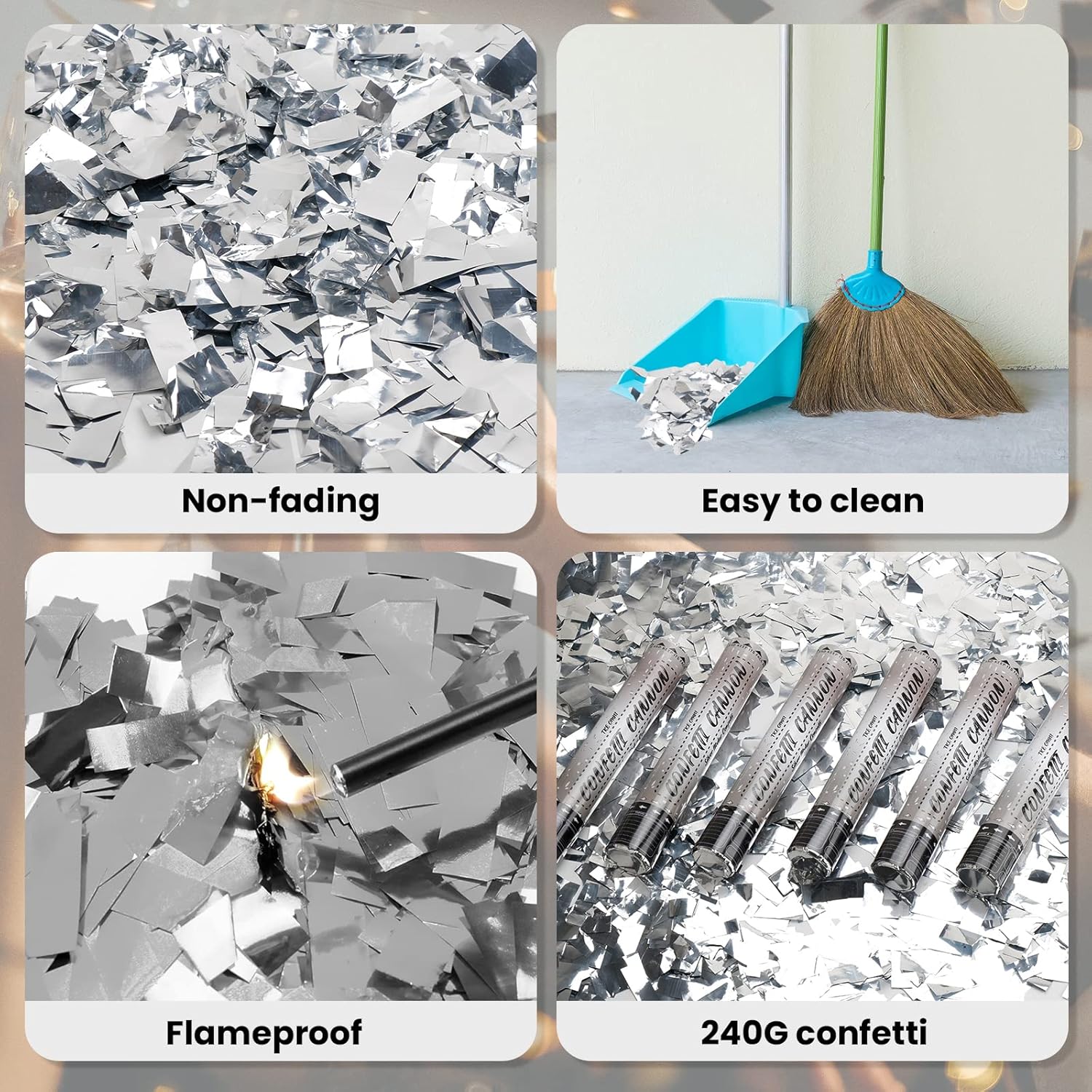 • πŸŽ‰ Get Ready For Silver Confetti Magic In The Air: Shower your guests with silver party confetti, or silver wedding confetti. Our air popper party cannon is filled with silver metallic confetti made of non-fade and fireproof mylar - the best party confetti!
