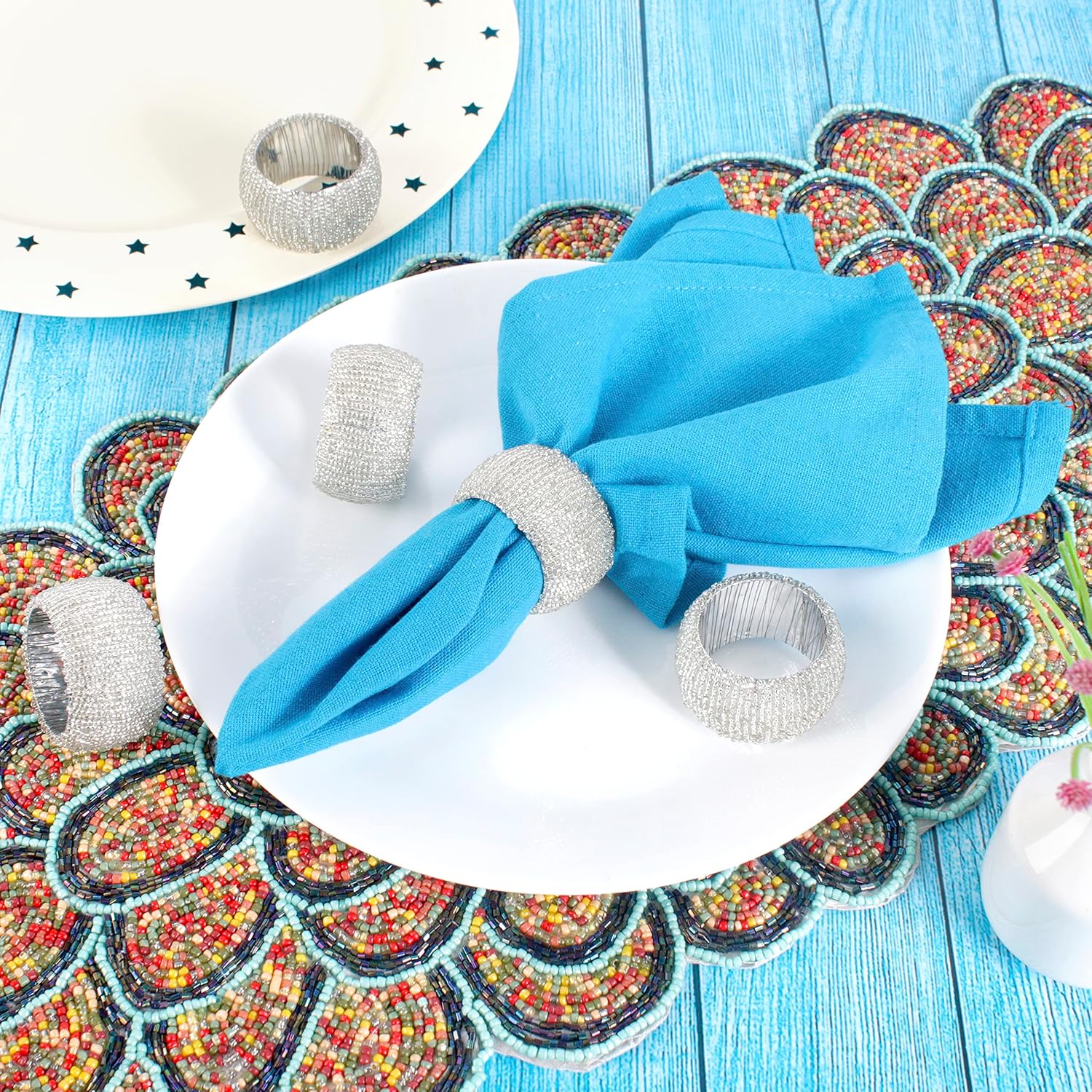 Decorative Beaded Napkin Rings Set of 12 - Rhinestone Serviette Holder for Table Décor, Christmas, Thanksgiving, Weddings, Parties, Artisan Festive Luxury Dining Napkin Holders (Silver) - CLEENTABLE