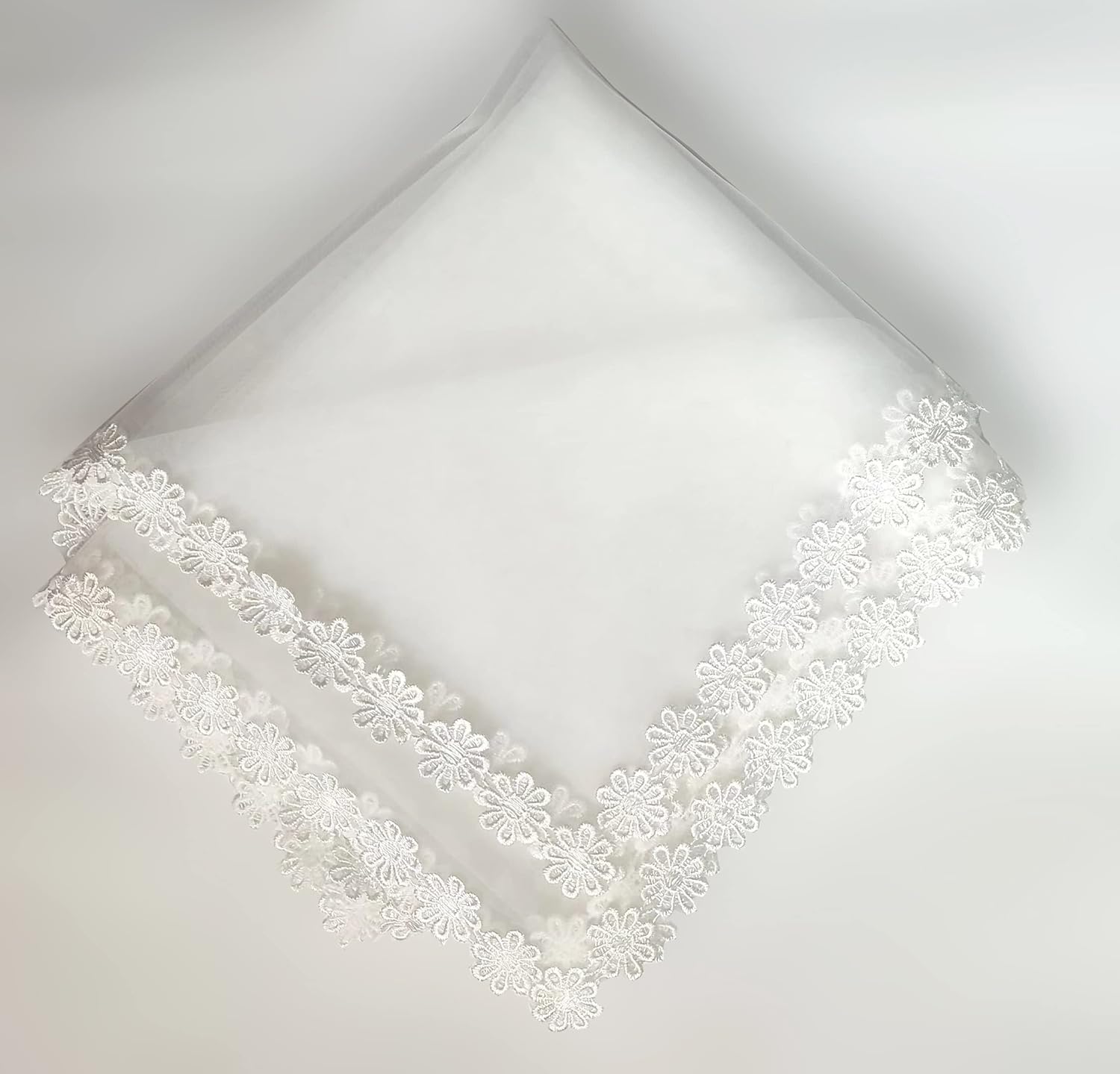 • The veil measures about 67 inches wide X 31 inches long.made of high quality tulle material, added with floral lace appliques