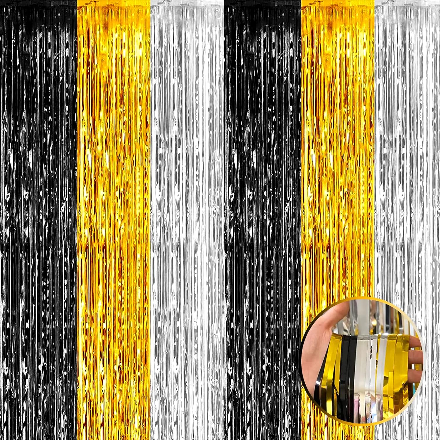 4 Pack Black Gold Silver Foil Fringe Curtain Backdrop, 3.28Ft x 8.2Ft Metallic Tinsel Foil Fringe Streamers for Photo Booth, Wedding, Notorious One Birthday Roaring 20s Graduation Party Decoration