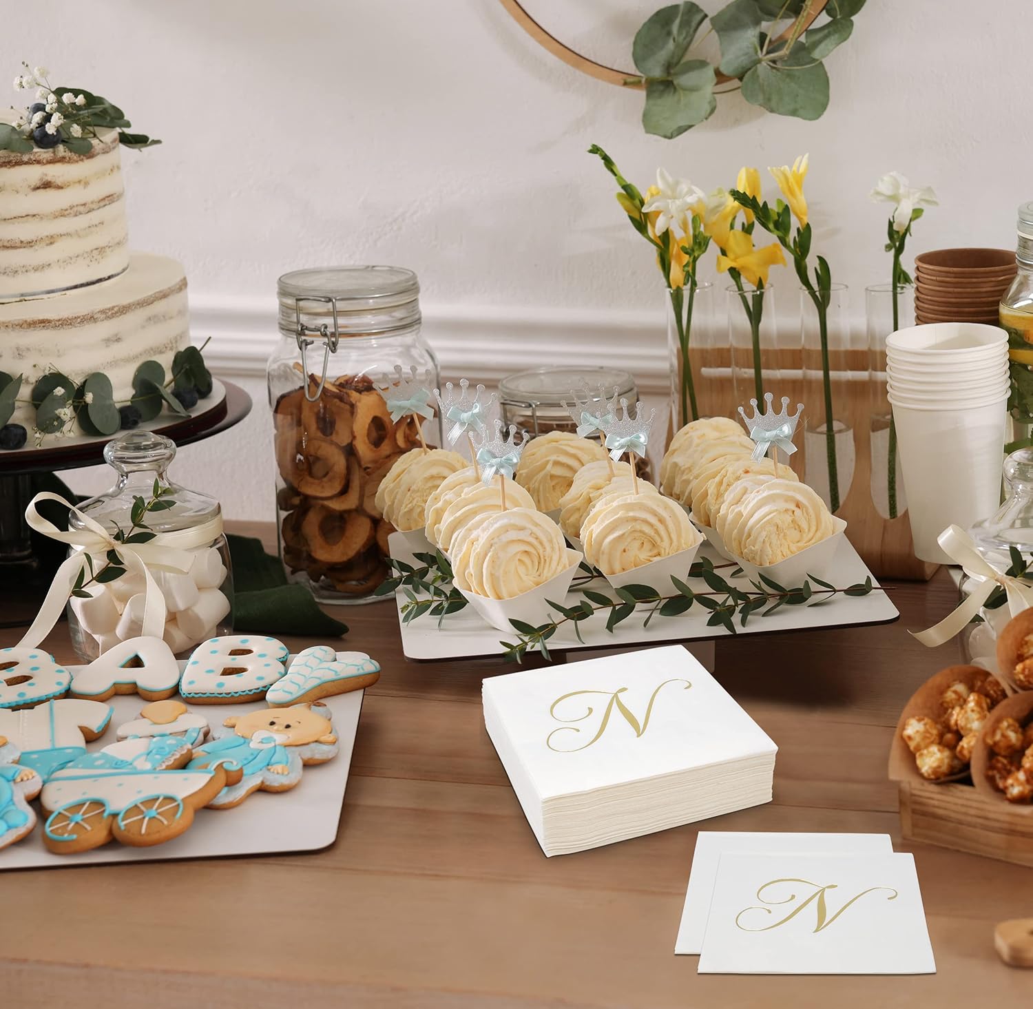 • Monogrammed Cocktail Napkins Serves 100: Gift Boutique square monogram cocktail napkins features the letter N printed in gold foil on white. These napkins will definitely enhance your table and impress your guests. These are essential for providing guests high-end comfort and luxury. Measures:5" x 5" folded and 10" x 10" unfolded.