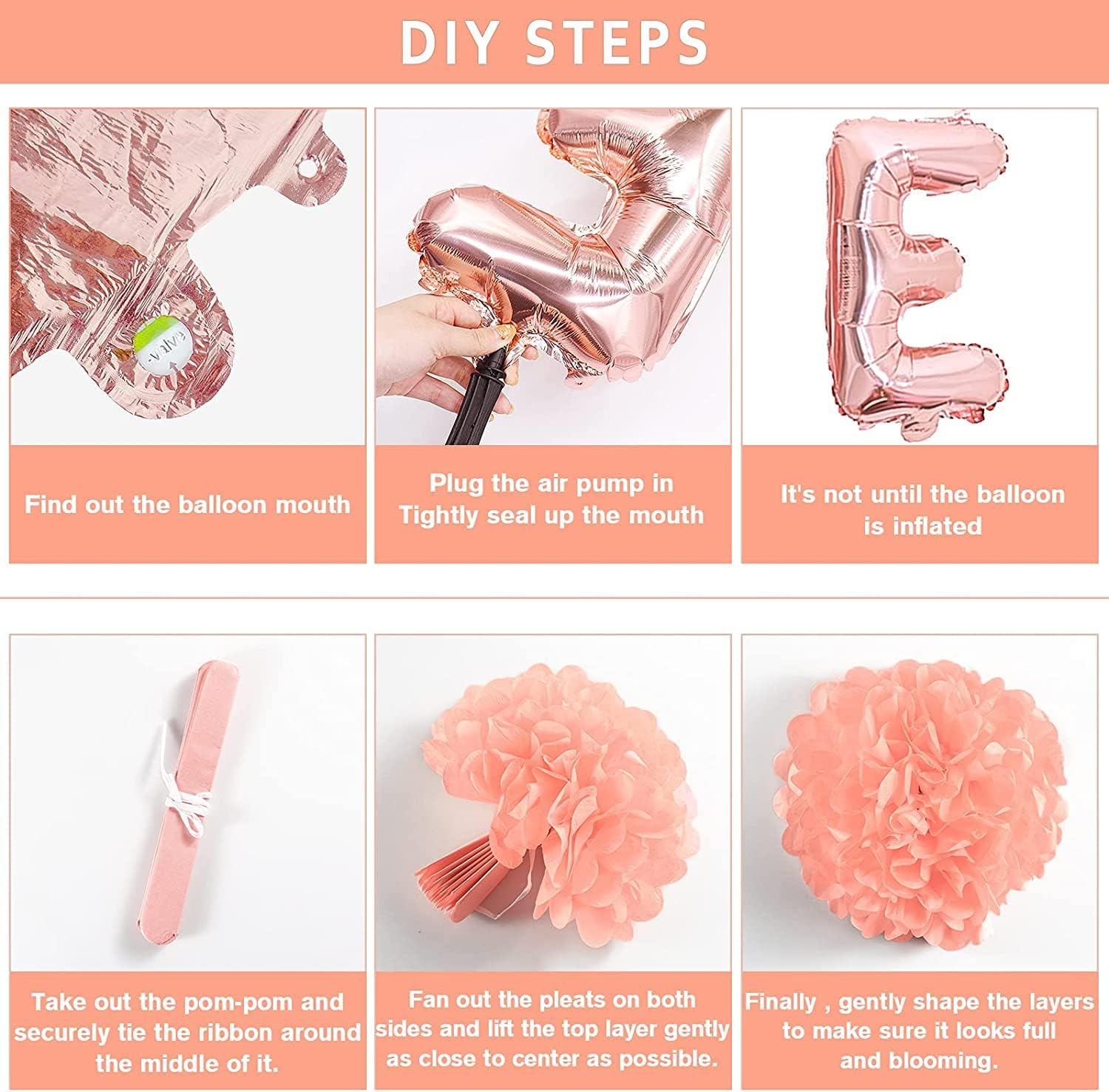 • Materials: The banner is made of glittery card stock that is reusable. Balloons are non-toxic & sturdy.The pom poms are tissue paper which is sturdy & long lasting.
