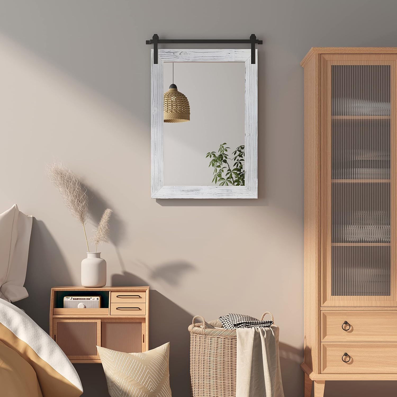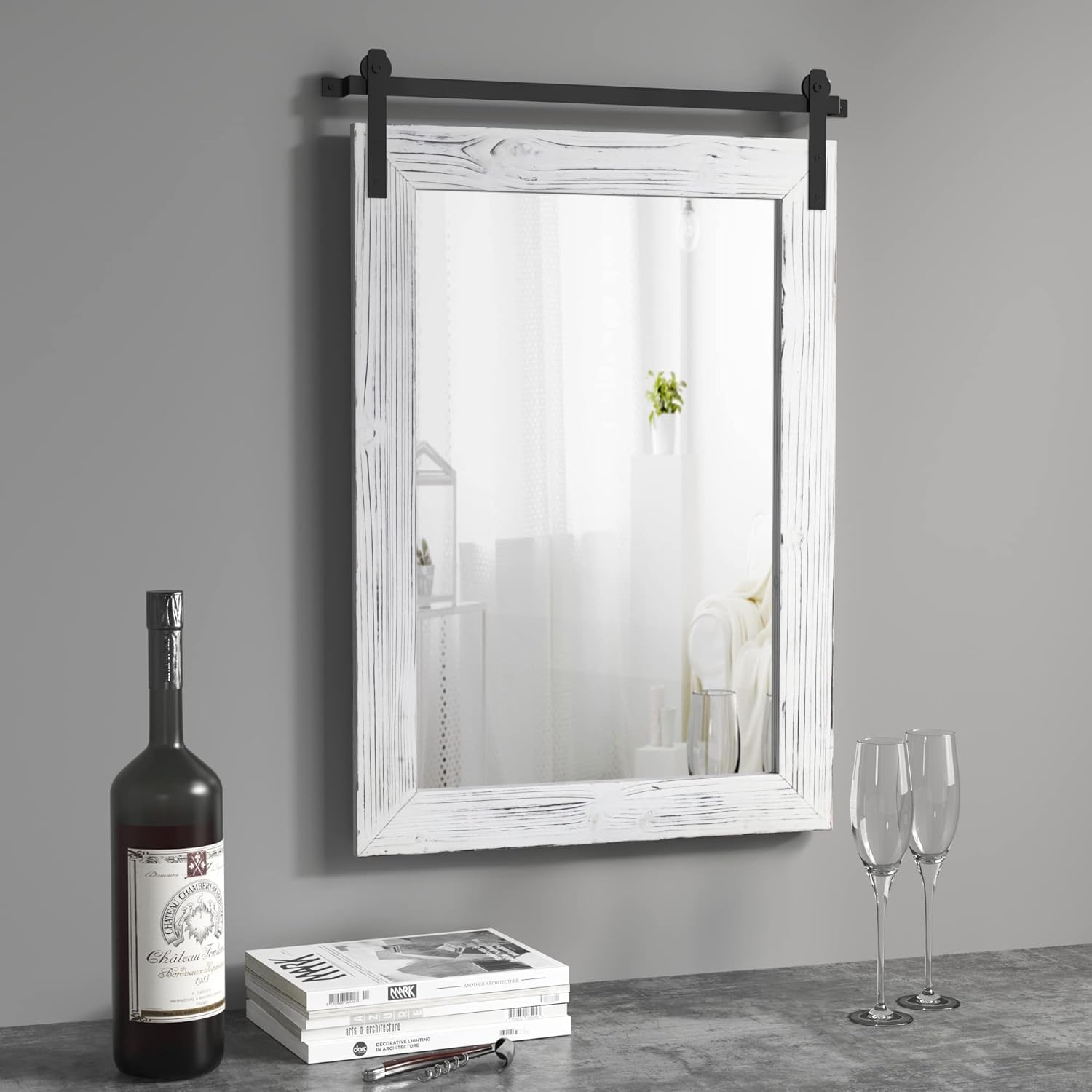 COGOOD Farmhouse Barn Door Mirror - 26" X 17" Rustic Wood Framed Wall Mirror for Bathroom, Living Room, Entryway Wall Decorative (White)