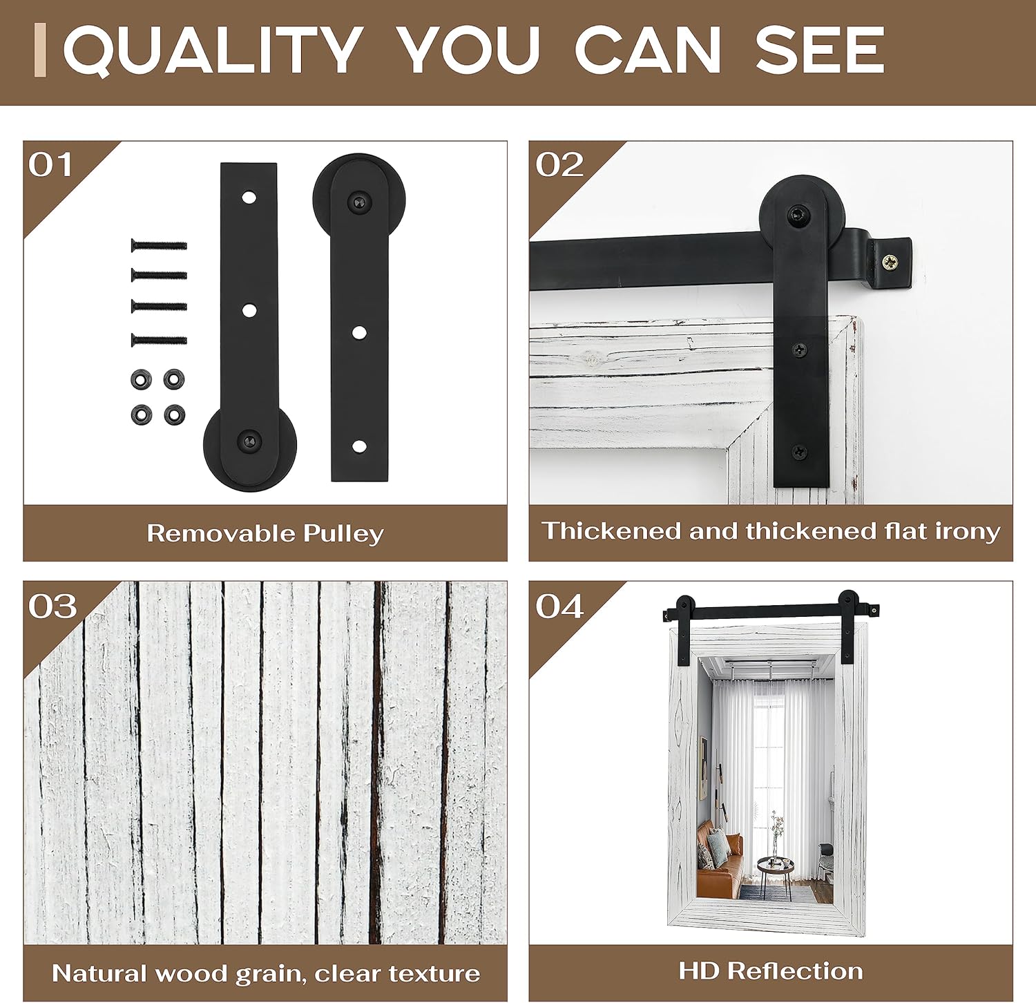 • QUALITY MATERIALS: The frame of the barn door mirror consists of an antique solid wood frame and a sturdy metal bracket. The interior features a 4mm HD silver mirror with clear and distortion-free reflections, providing a better sense of light and projection in your space