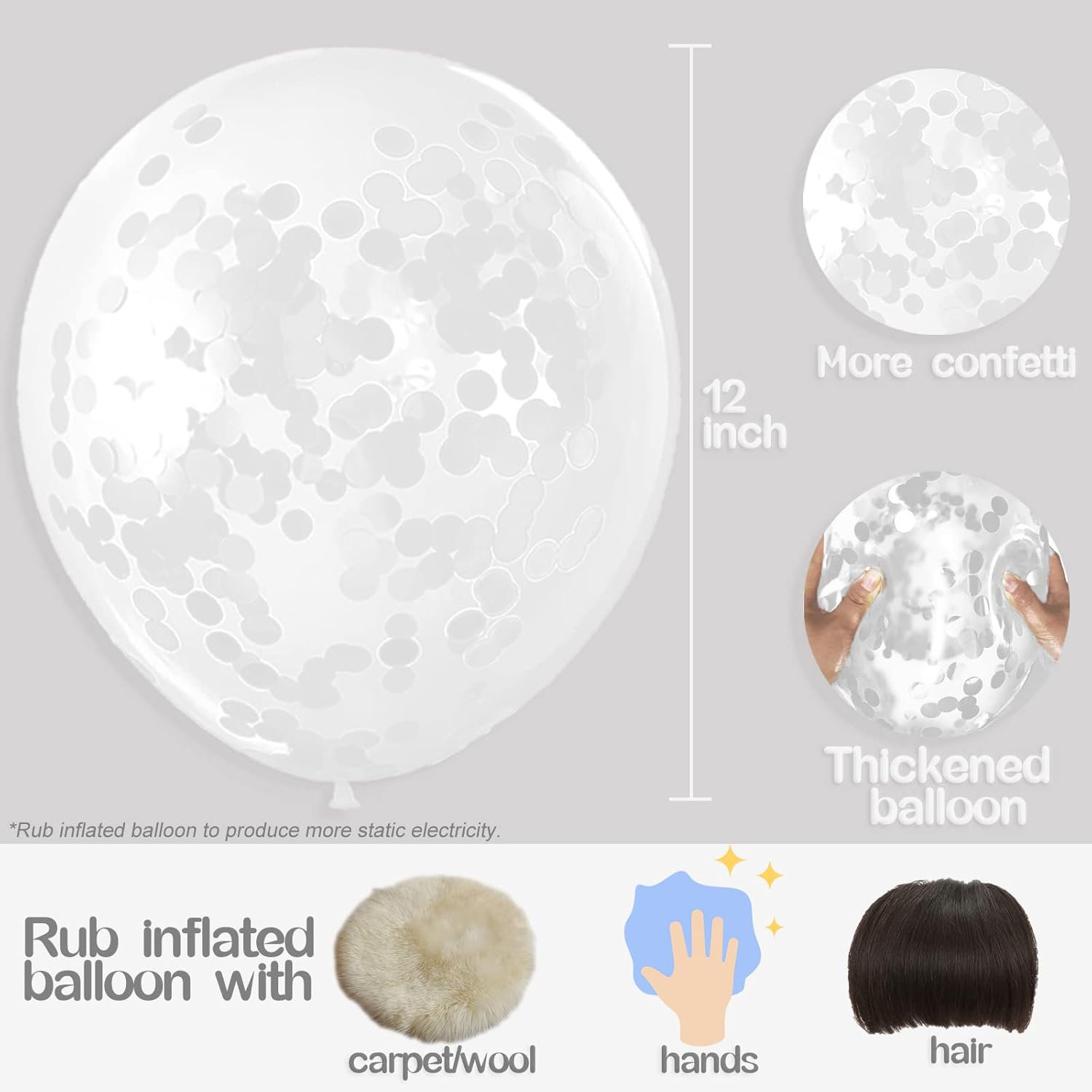 • How to Use: After inflating the balloon, rub the balloon repeatedly with your hand or hair, the static electricity will be evenly distributed inside the balloon, which will help the confetti stick to the balloon