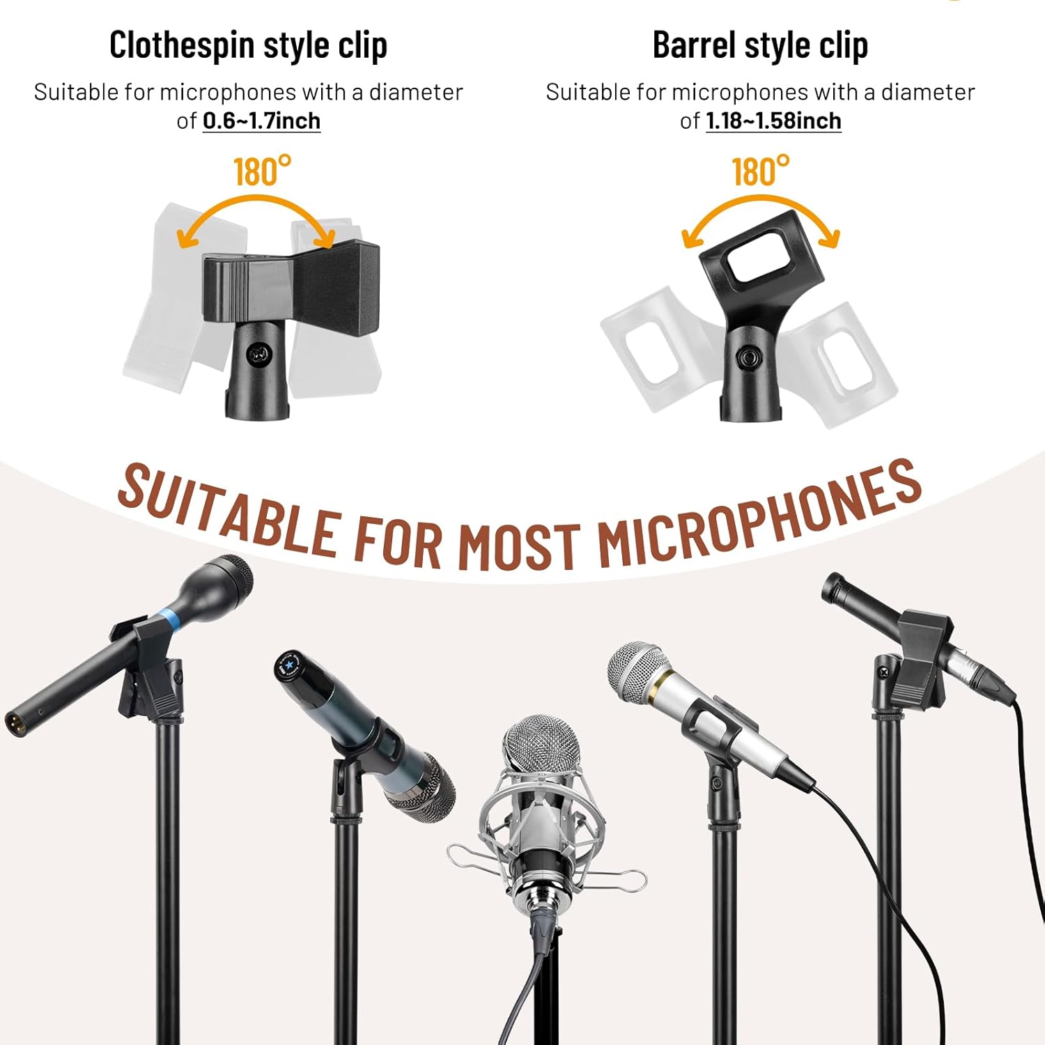 • 2-IN-1 BOOM & STRAIGHT MIC STAND: Simply remove the boom arm and attach the mic clip to convert the boom stand to a straight mic stand. It also comes with 2 types of microphone clips which allow you to fit most types of microphones. Perfect for concert, speech, video conference, stage, wedding, recording studio etc.