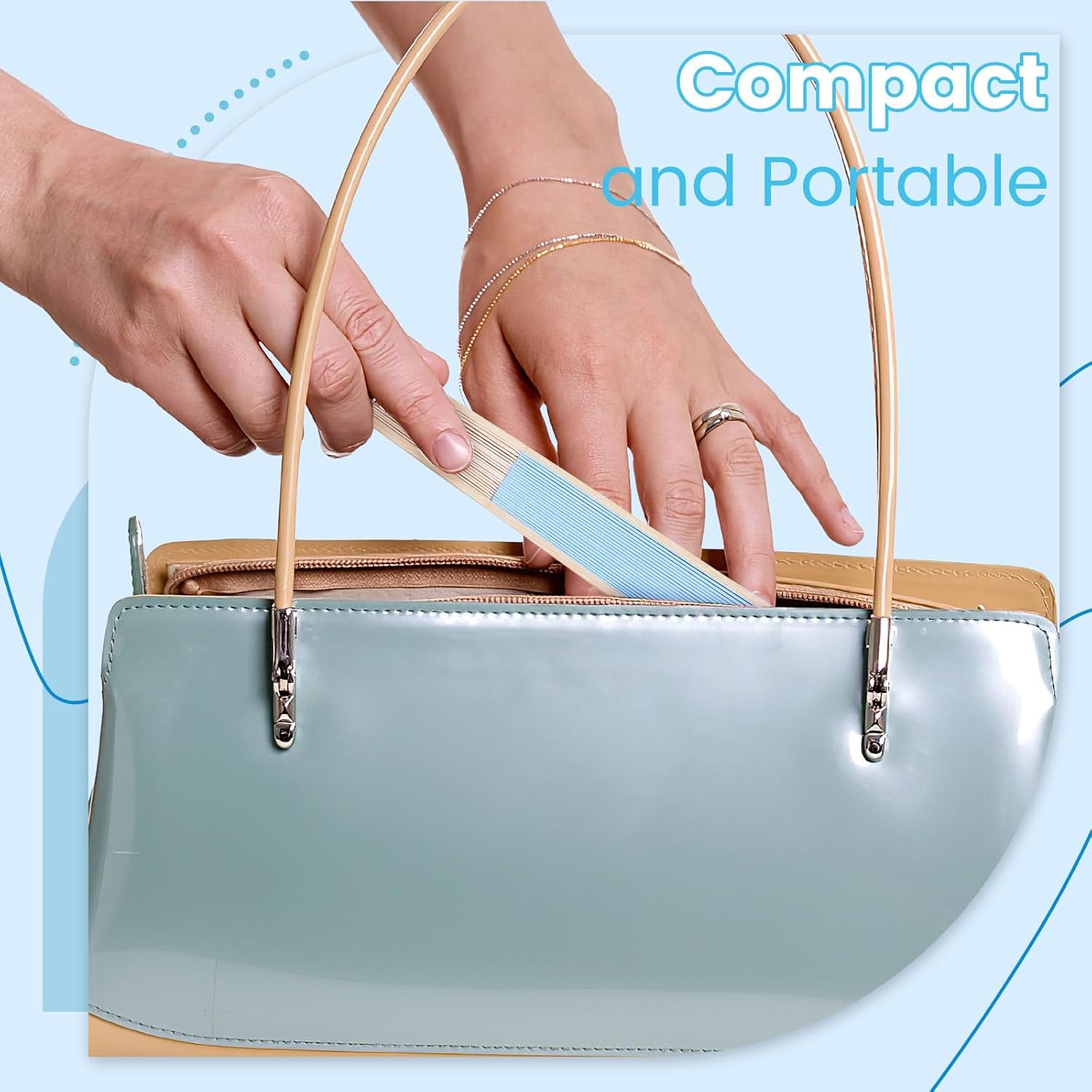 • Natural Material · Feel the Breeze – Made with Inner Pith Bamboo and paper in cerulean, navy, and light blue, these folding fans highlight the natural grain of bamboo with a smooth, flexible finish. Because authentic bamboo is used, slight imperfections may appear but can be gently smoothed without affecting use. Each fan combines cooling comfort with a decorative accent.