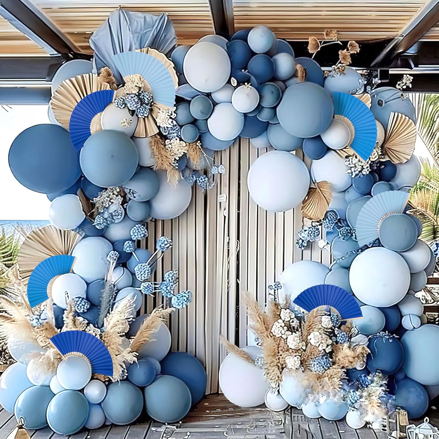 • Eastern Elegance · Symbolic Patterns – Decorated with lotus petal and crescent moon details, these fans carry traditional Eastern symbols of peace, romance, and blessings. As blue party decorations or as wedding props, they bring both elegance and cultural meaning whether in use or on display.