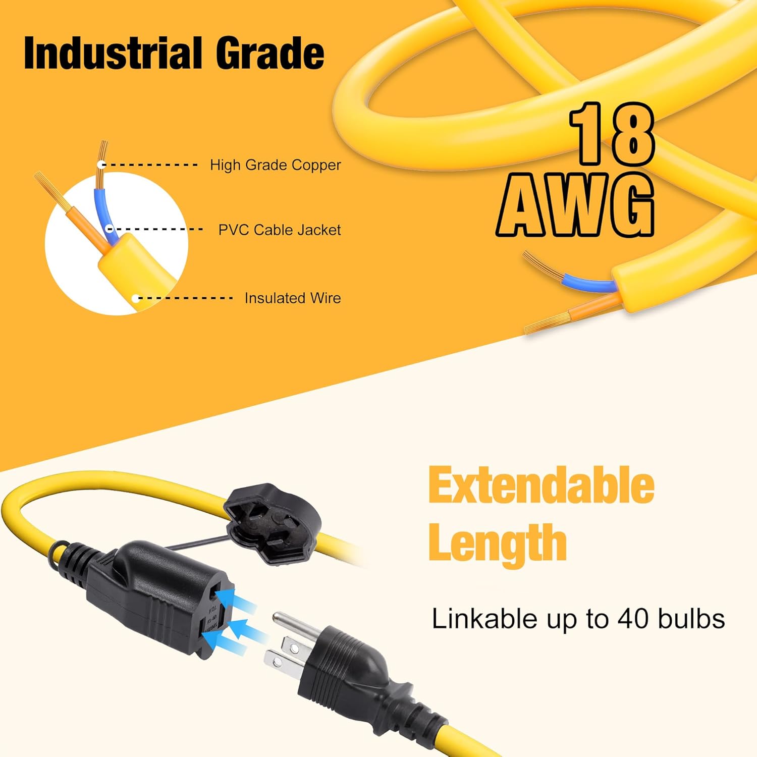 • Portable, Flexible, Extendable, Temporary: LED construction string lights equipped with 10 climbing hooks and 100ft power wire, This LED string work lights is more flexible than ordinary temp string lights construction. You can arrange the LED construction string light distribution on site to avoid concentrating Lumens in a small area, This crawlspace lighting can be daisy-chained up to 4 sets