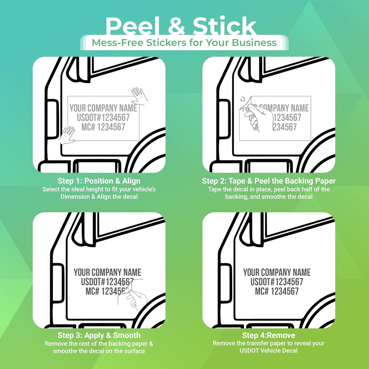 • MADE IN THE USA: Truck window decals are Established with carefully sourced materials and manufactured with standard methods and precision. Stand for made-in-America quality with a product that keeps your business branding accurate, long-lasting, and legally compliant. We offer one side of the USDOT decal per customized order. If you want to cover both sides of your truck, you will need to buy two listings. You can type your DOT info twice on two lines and cut the decal for each side.