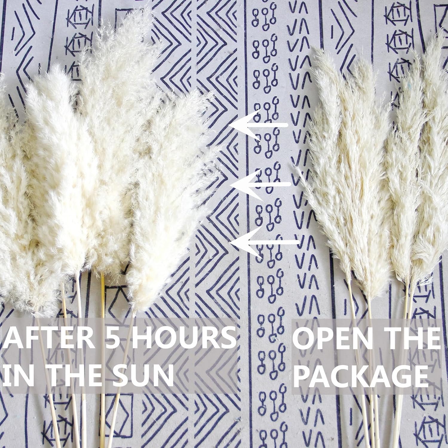 • Tips: After packaging and transportation, the white feathers of dried pampas grass may experience slight shrinkage. We recommend placing the dried palm leaves under the sun for a few hours to allow them to dry and become fluffier. This will enhance the appearance of the boho flowers and make them more suitable for dry flower decor, giving them a modern, well-shaped look.