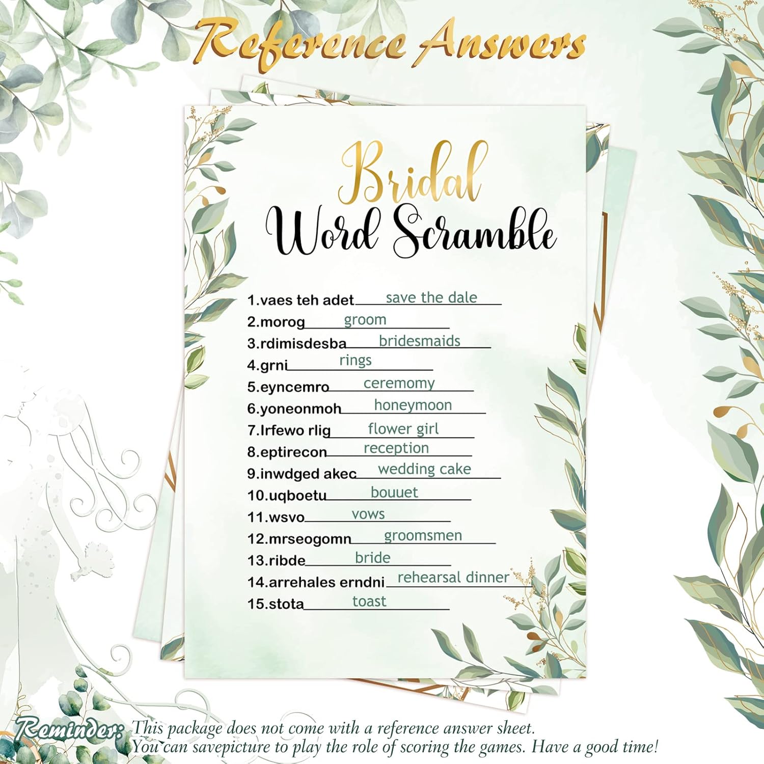 • 5 Styles of Fun Bridal Shower Games: our game bridal shower cards contain 5 fun games, including "Would She Rather", "Bride Or Groom Guess Who", "Bridal Word Scramble", "Wishes For The Bride And Groom", "What's In Your Purse"; These cards provide your guests with a fun wedding game to help them fully enjoy the party and elevate the mood