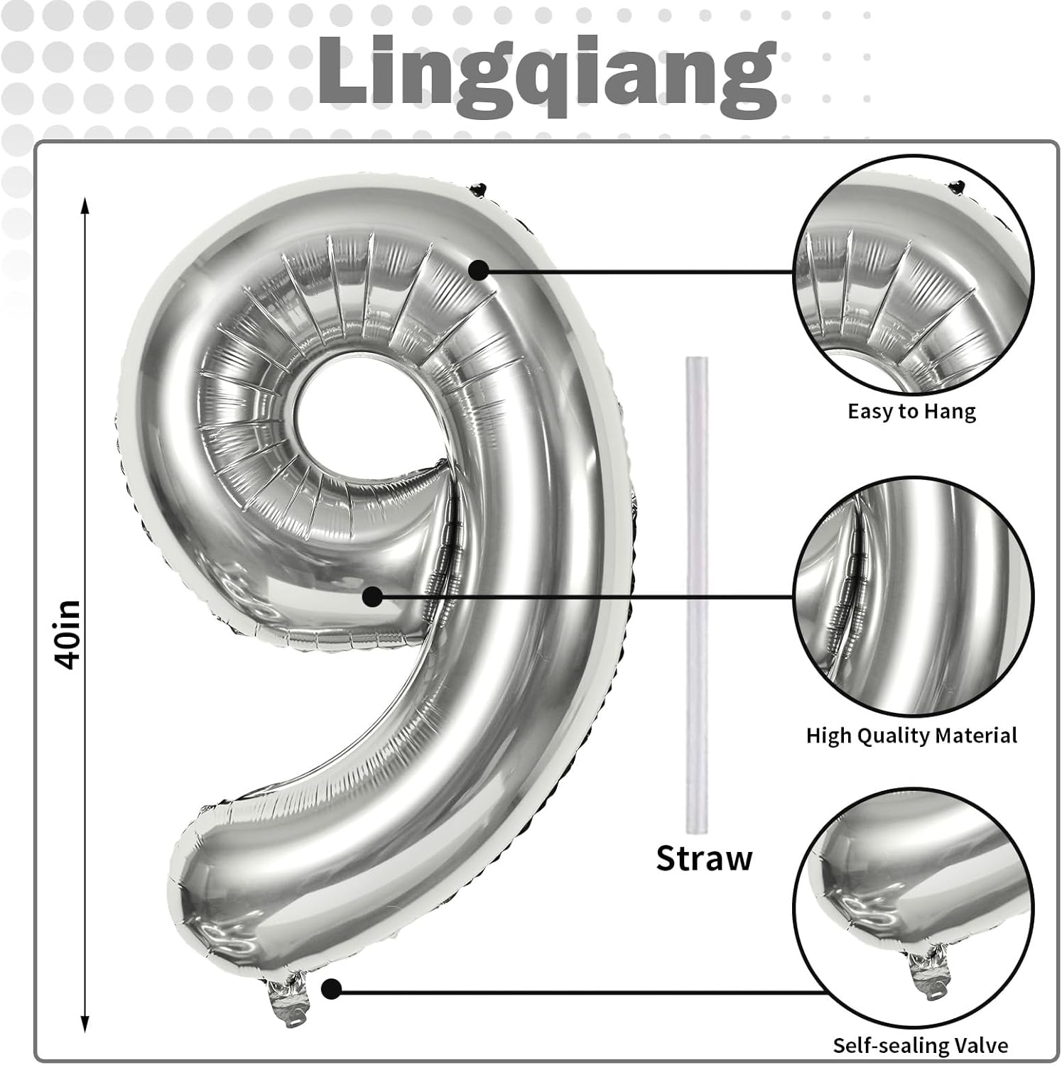 • πŸŽ‰ Silver Number 9 Balloon πŸŽ‰ - You will get 1pc 40 inch mylar foil number 9 balloon and 1pc straw. Perfect for 9th 19th 90th birthday or anniversary party decorations supplies.