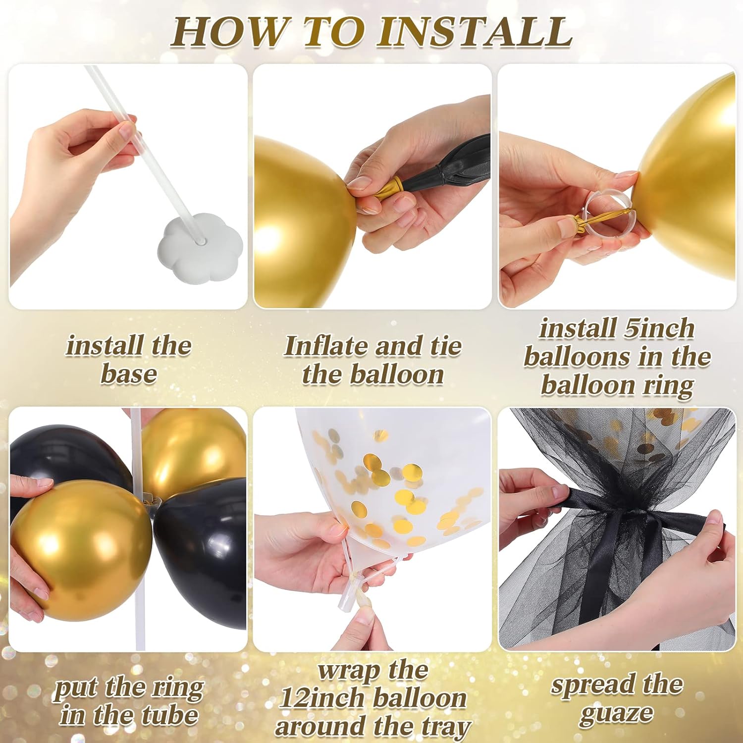 • Easy Installation and Disassembly: connect the balloon rod to the balloon base, then connect the balloon to the balloon ring, assemble the size of 12 inch gold balloon and the black gauze with ribbon, use the circular ring buckle to assemble the size of 5 inch balloons of different colors into a garland, creating a distinctive and beautiful atmosphere