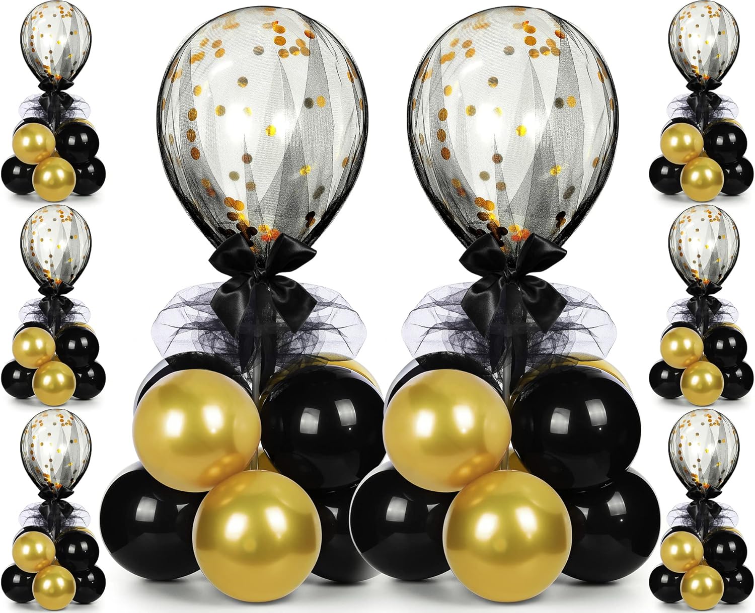 BBTO 8 Set Table Centerpieces Balloons Stand Kit, 80 Pcs Latex Balloons and Table Stand Holder with Base Tulle for Wedding Birthday Baby Shower Party(Black, Gold)
