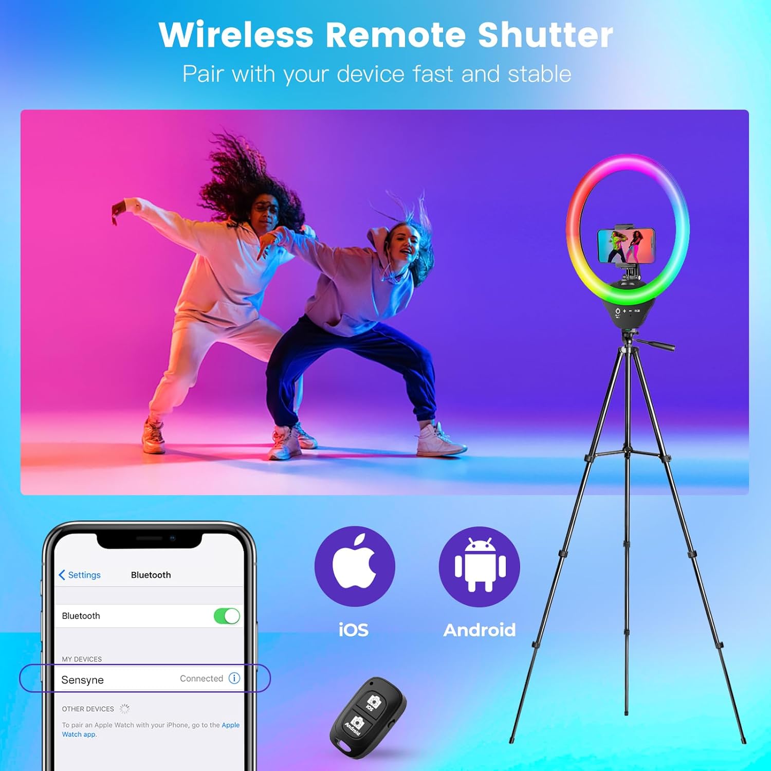 • 17 Lighting and Color Modes: Sensyne selfie ring light features 14 RGB lighting modes (8 monochrome static + 6 dynamic modes) and 3 traditional lighting options (white/warm yellow/natural) with 10 levels of brightness, you can freely switch between 17 lighting modes. Perfect for makeup, photography, painting, dancing, taking pictures, live streaming, or acting as fill light, floor lamp, etc.