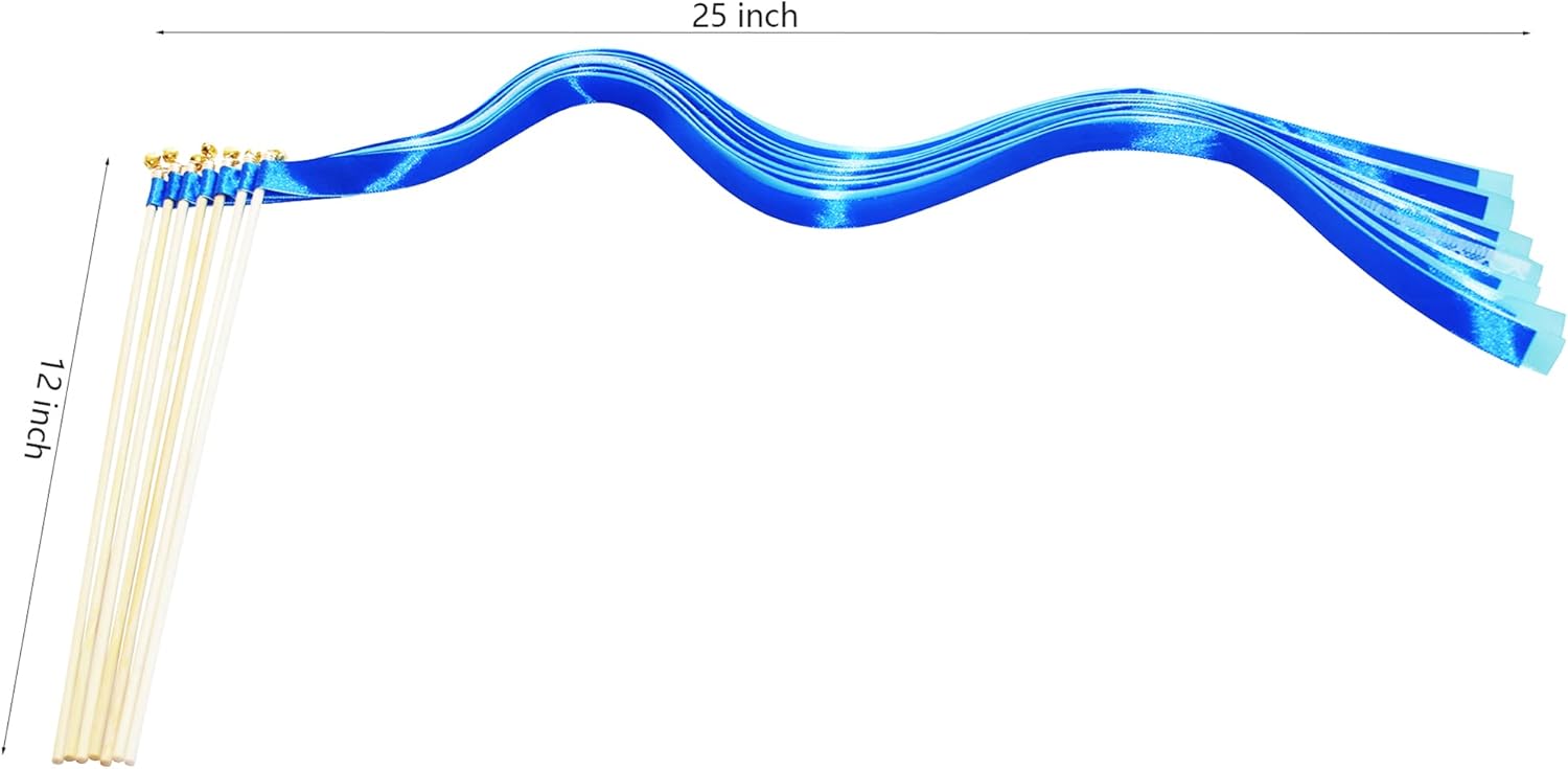 • Each fairy wand has 3 pieces blue ribbon streamer in 24"long, and 1 fairy wooden stick in 12" long with a gold bell. Your special day is nearly upon you, so add the finishing touches to your reception or ceremony starting with our quality Ribbon Wands.Have fun with it as you put the finishing touches on your special day.