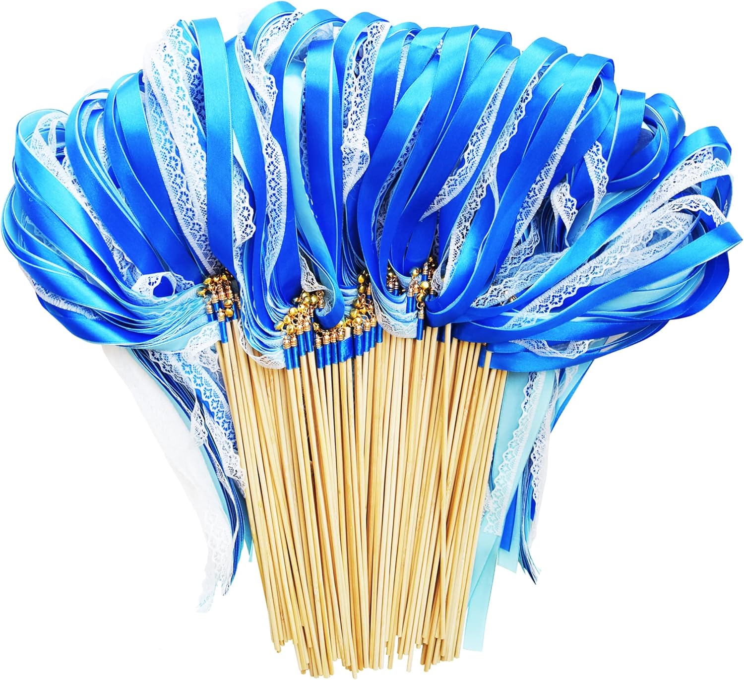 100 Pack Blue Lace Wedding Ribbon Wands Streamers with Bells Silk Fairy Wands Sticks Wedding Exit Ribbon for Party Activities Bridal Shower Send Off Holiday Celebration