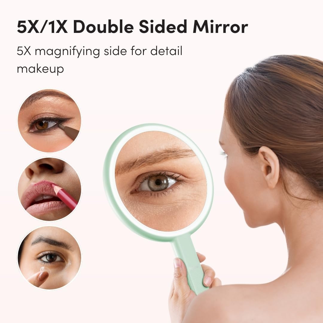 • Dual-Sided Magnification โ€“ 1X mirror for full-face makeup; 5X magnifying mirror for precision tasks like eyeliner and tweezing.