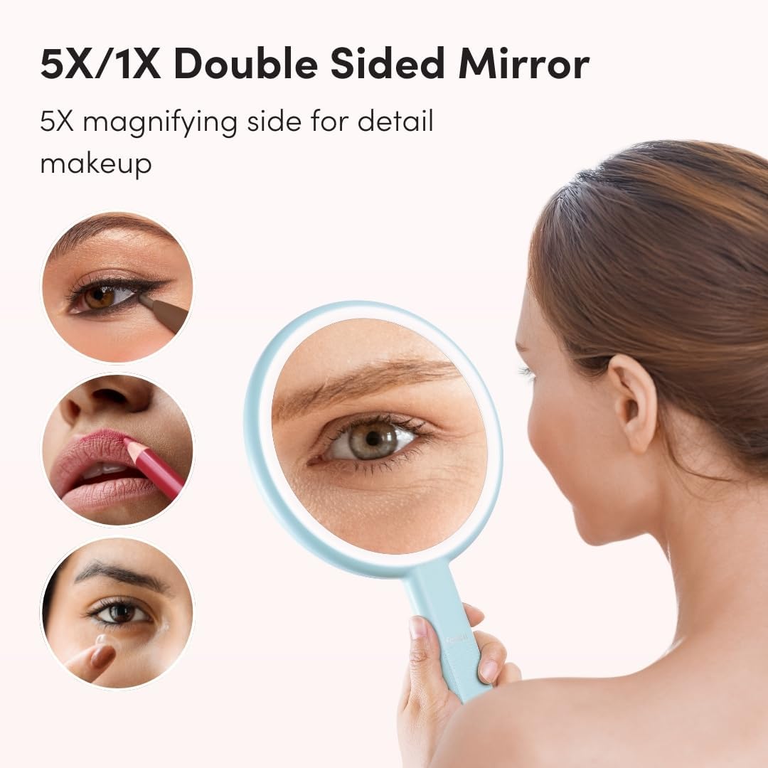 Fancii Cami Handheld Travel Makeup Mirror with Lights, Rechargeable, Extra Large, Double Sided 5X / 1X Magnifying Mirror - 3 Color Lighting, Handheld or Vanity (Blue Fluff)