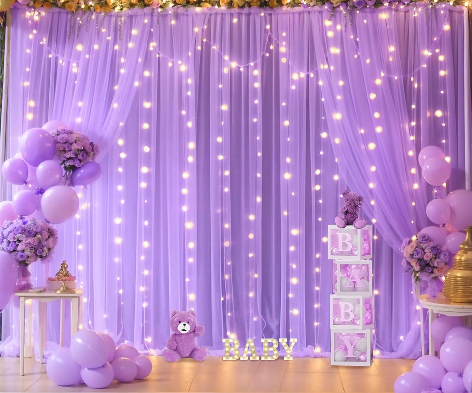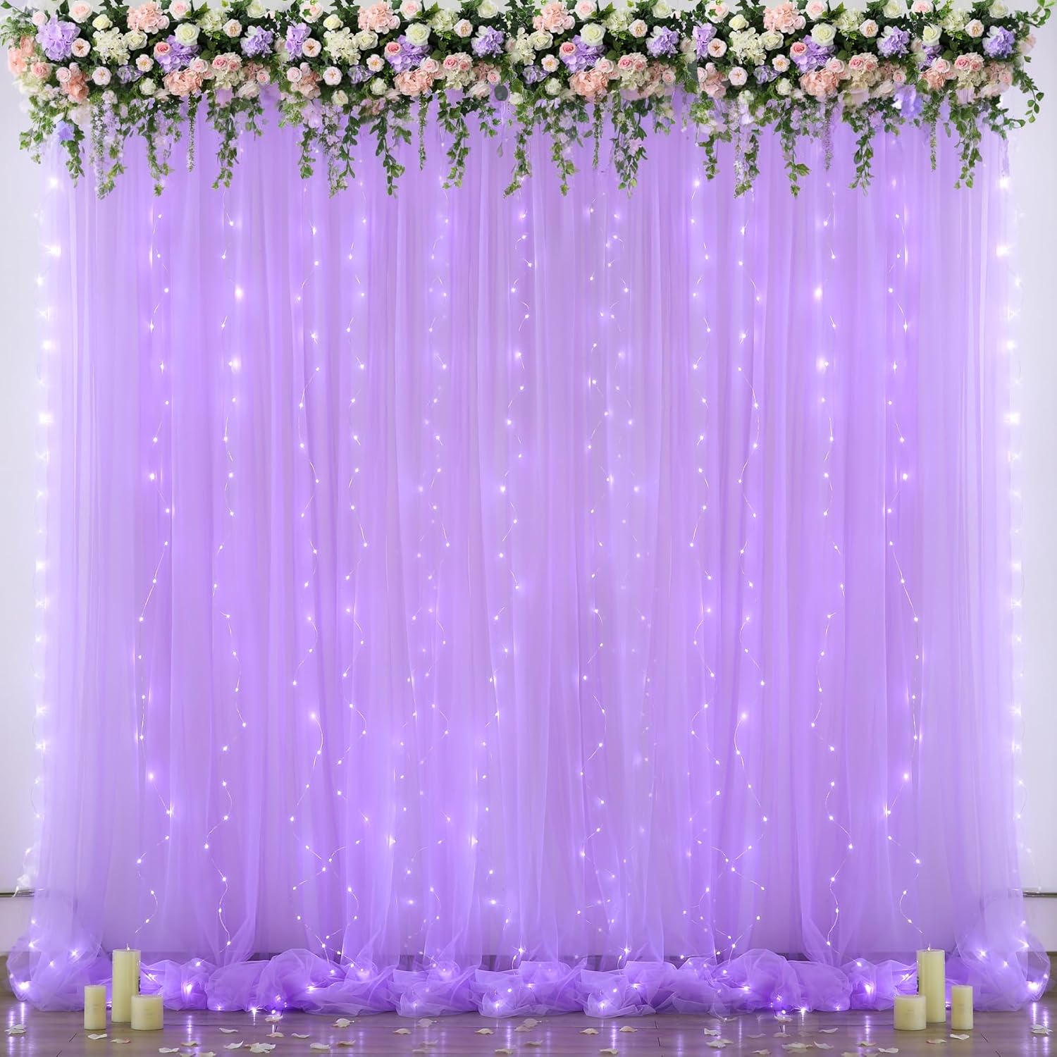 • Products include: 10ftΓ—8ft sheer lavender curtains for backdrop, a set of 9.8ft warm white string light and 12pcs Transparent clips (no remote control).