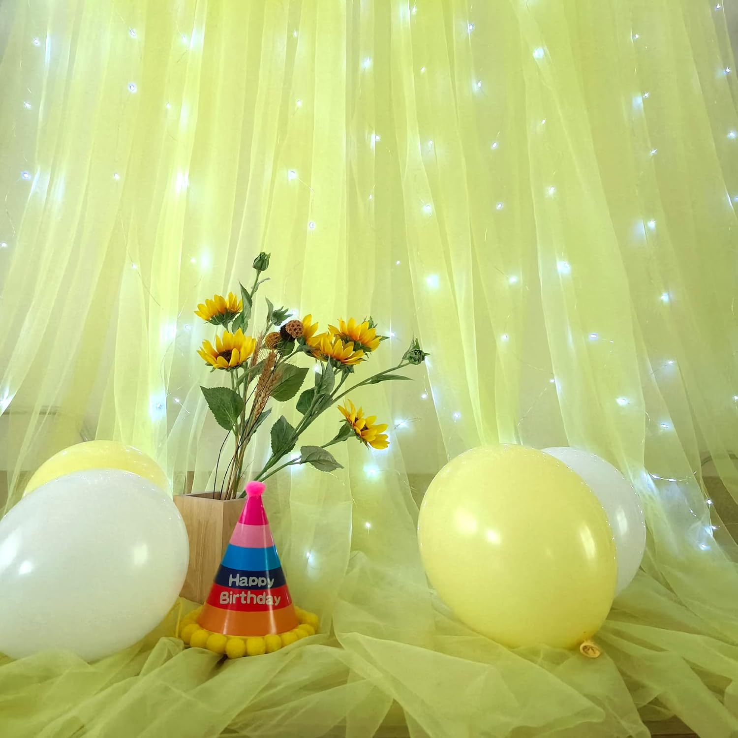 • Products include: 10ft×10ft yellow sheer tulle backdrop curtain, a set of 9.8ft warm white string light and 12pcs Transparent clips (no remote control).