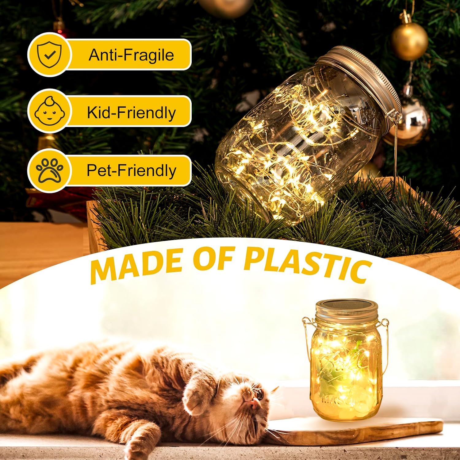 • 8 Pack Mason Jar Solar Lanterns: High-quality and durable clear plastic material jar, made of 30 warm white bright LED beads twisted into a silver wire; Unlike glass jars, our jars are lighter, more durable, can serve for a long time and unbreakable; 8pcs stainless steel hanger are included to help you easily hang the assembled mason jar lights on thinner branches, fences, walls and porches, very convenient