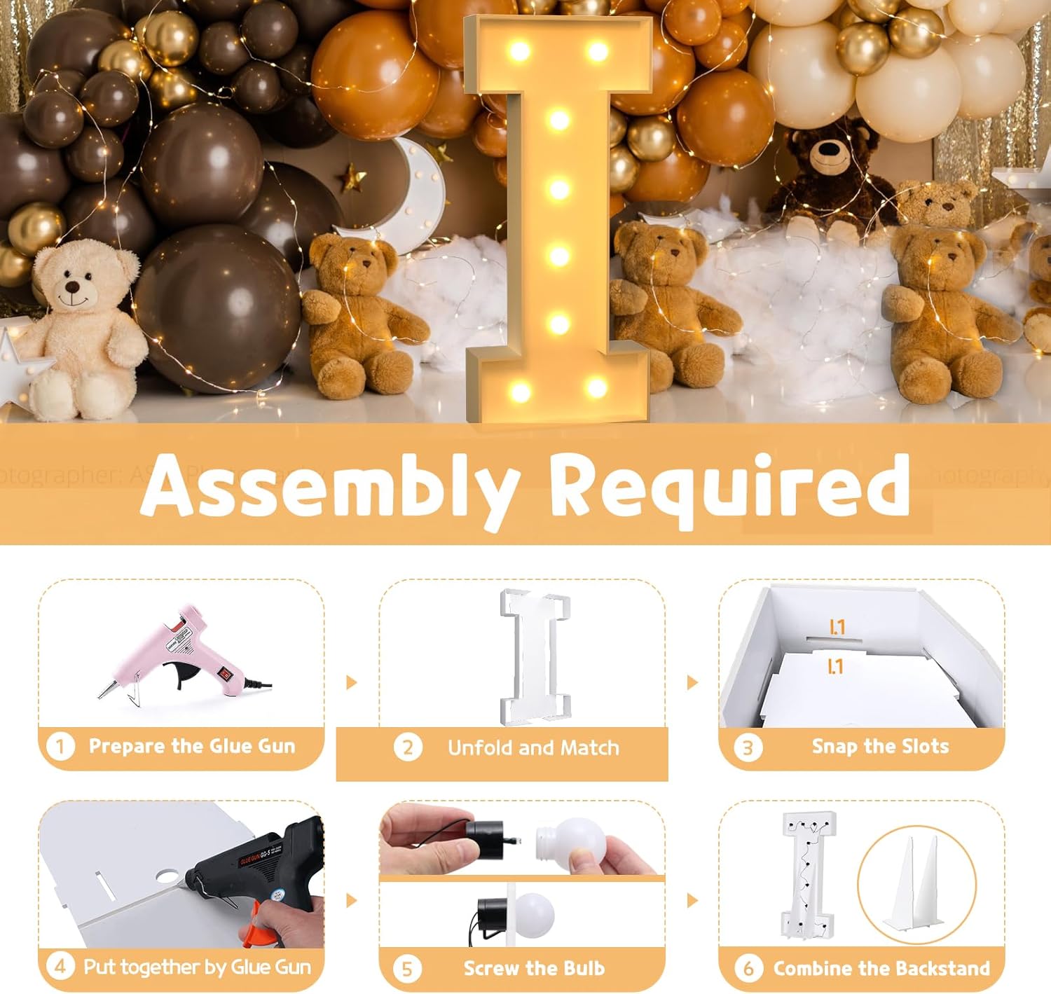• Assembly Needed: Each marquee letter are pre-cut frame with slots, 1) Match the slots on the board and put all boards together by hot glue. 2) Screw the bulbs on the board and install 3 AA batteries. (Noted: Glue gun and batteries are not included)