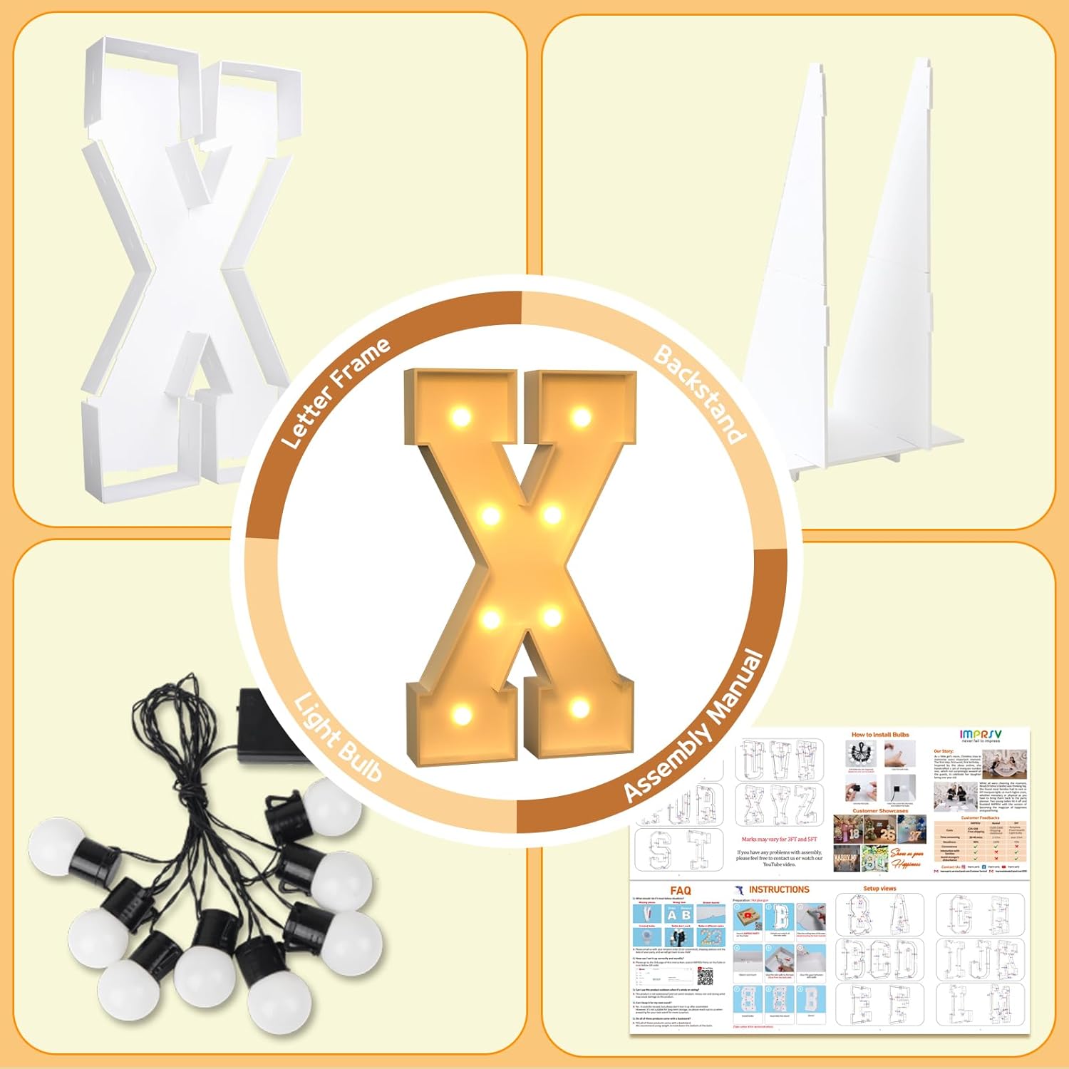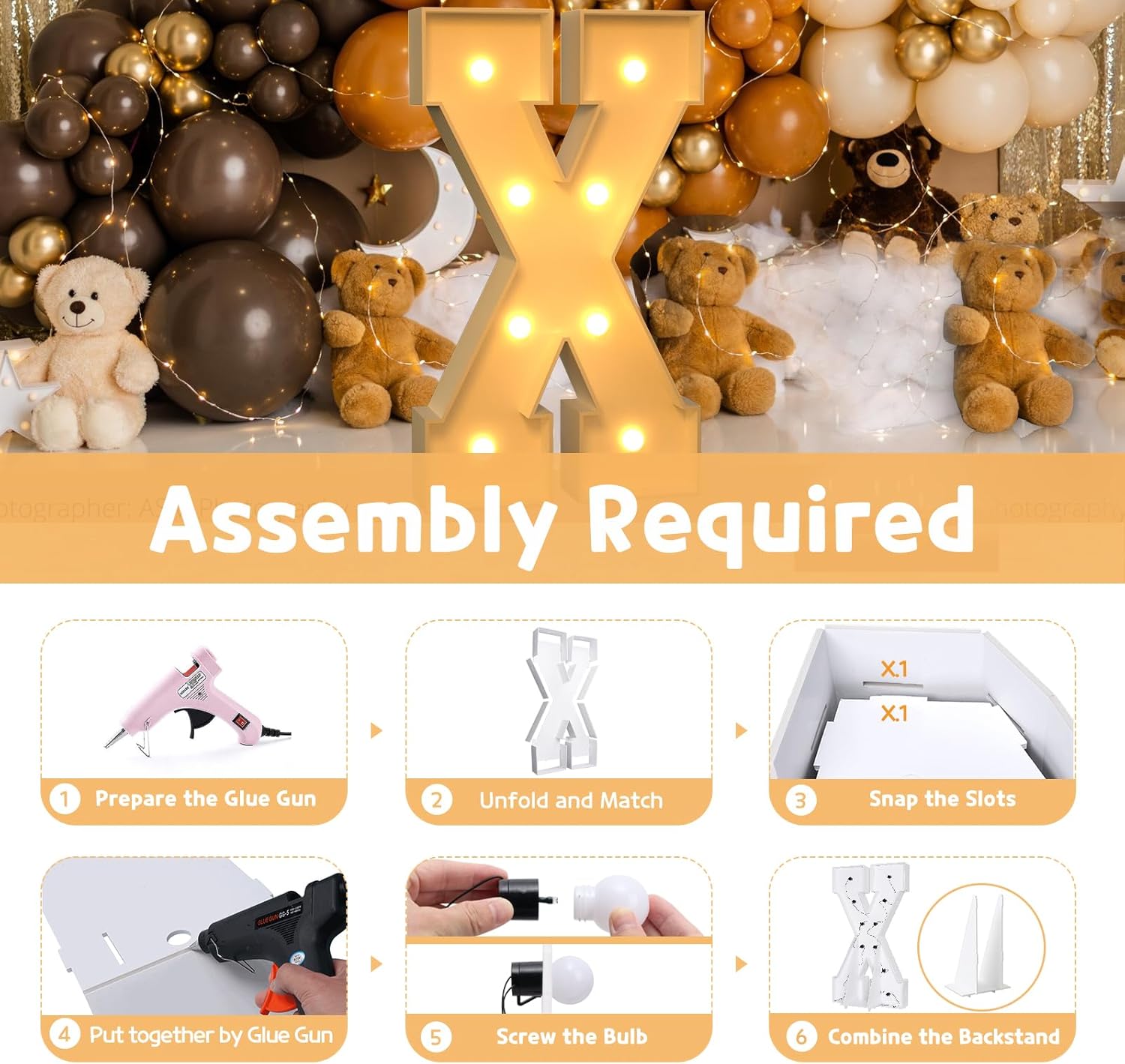 • Assembly Needed: Each marquee letter are pre-cut frame with slots, 1) Match the slots on the board and put all boards together by hot glue. 2) Screw the bulbs on the board and install 3 AA batteries. (Noted: Glue gun and batteries are not included)