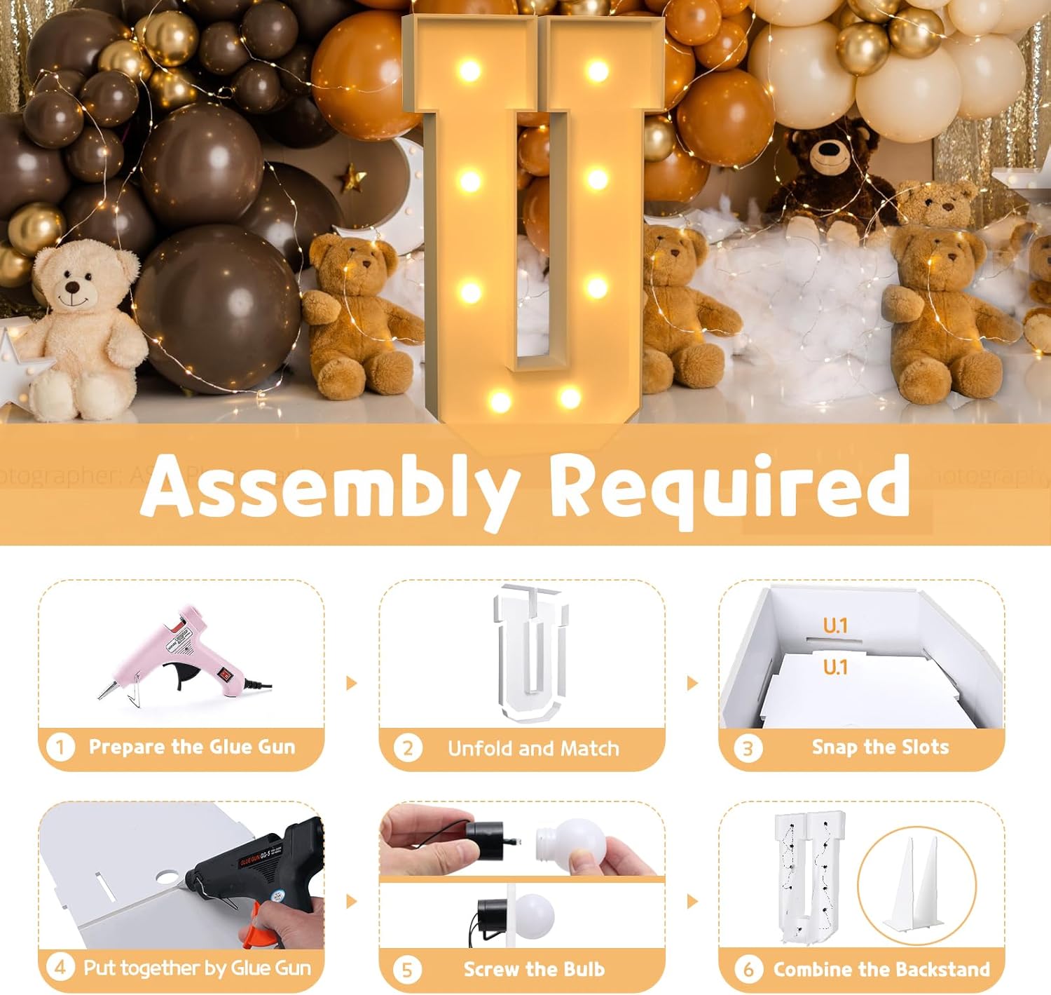 • Assembly Needed: Each marquee letter are pre-cut frame with slots, 1) Match the slots on the board and put all boards together by hot glue. 2) Screw the bulbs on the board and install 3 AA batteries. (Noted: Glue gun and batteries are not included)
