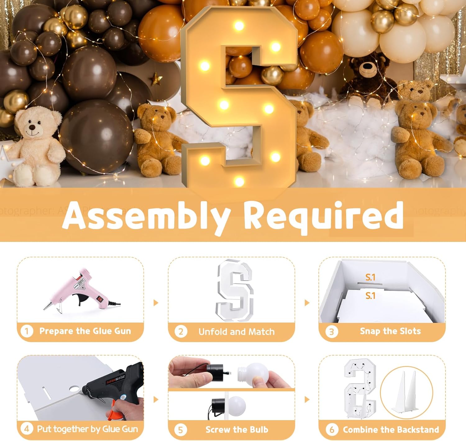 • Assembly Needed: Each marquee letter are pre-cut frame with slots, 1) Match the slots on the board and put all boards together by hot glue. 2) Screw the bulbs on the board and install 3 AA batteries. (Noted: Glue gun and batteries are not included)