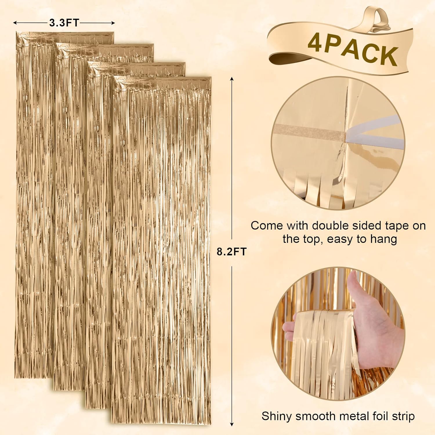 4 Pack Champagne Foil Fringe Backdrop Curtains, Tinsel Streamers Birthday Party Decorations, Fringe Backdrop for Graduation, Baby Shower, Gender Reveal, Disco Party