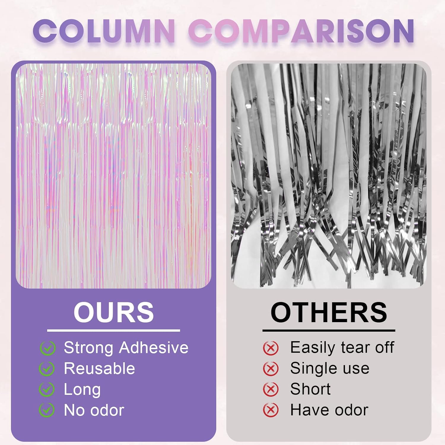 • Package Included: 4 packs of foil fringe curtains, the size of the foil curtain is 3.3*8.2 ft. It's long enough to fit any occasion. Please do not stick the foil curtain on uneven or stained walls to prevent it from falling off