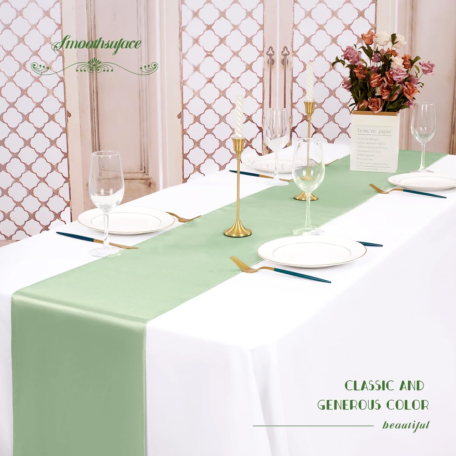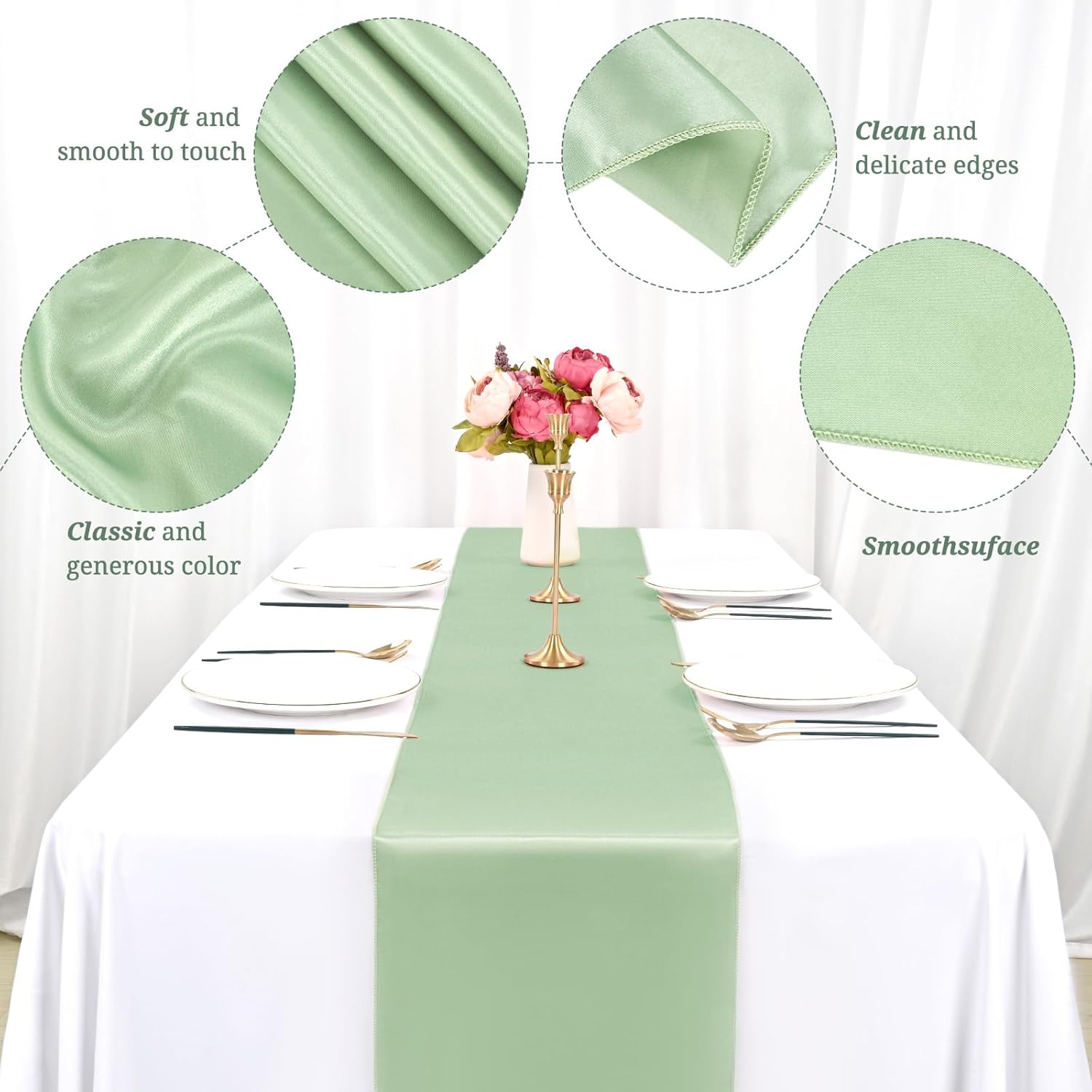 • 🍀【Sage Table Runner】12 Pack sage green satin table runner measures 12" x 108" in size, appropriate for a table that can seat 8-10 people. This satin table runner can fit a 6ft/8ft rectangular table or round table well.This satin table runner is great for event table decorations.Our satin table runner make your dining table more dazzling and outstanding.Purchase our 12 piece Showgeous satin table runner and save even more.