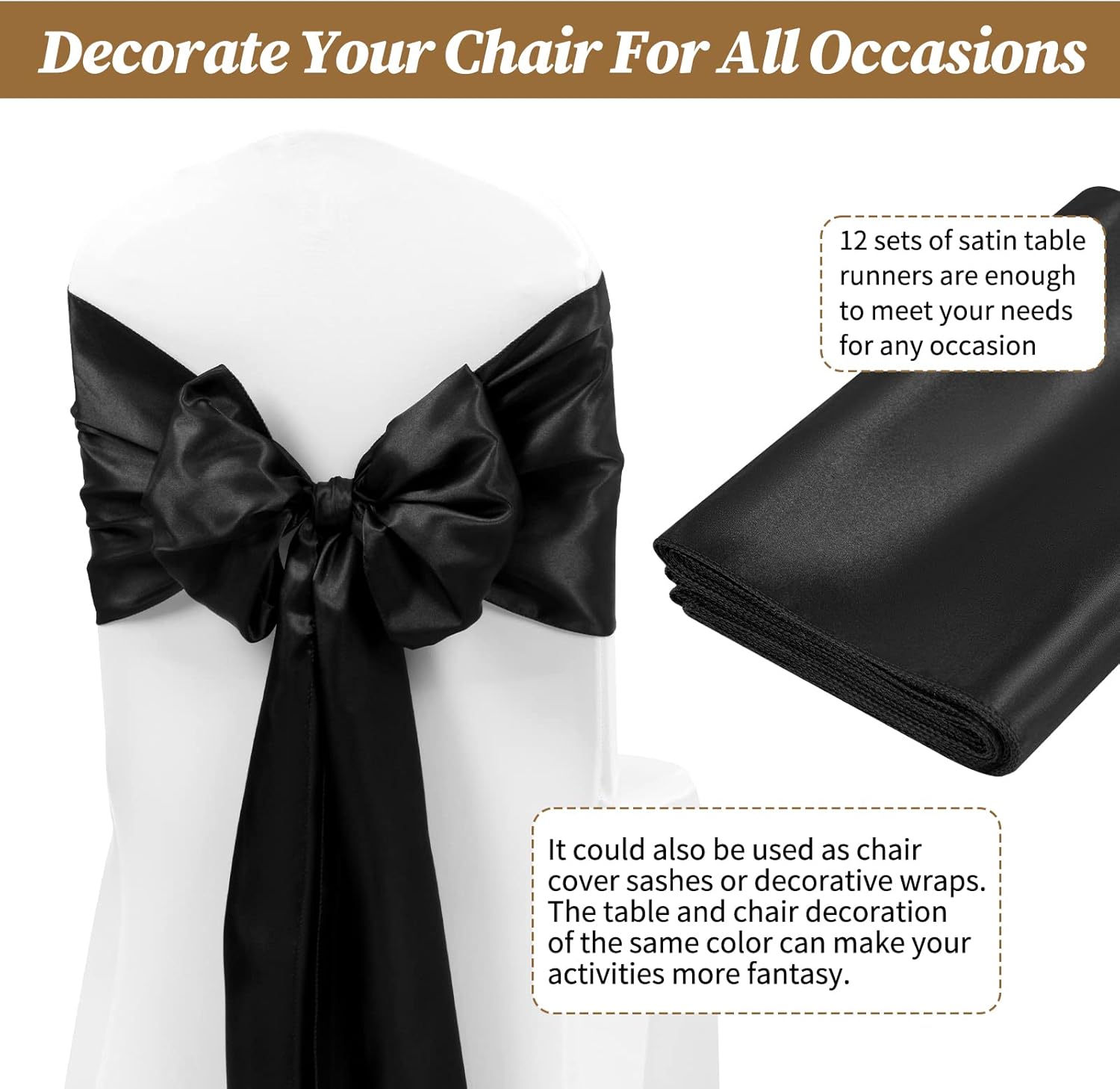 • 🥂【Black Satin Table Runner Set】12 Pack black satin table runner measures 12" x 108" in size, appropriate for a table that can seat 8-10 people. This satin table runner can fit a 6ft/8ft rectangular table or round table well.This satin table runner is great for event table decorations.Our satin table runner make your dining table more dazzling and outstanding.Purchase our 12piece satin table runner and save even more.