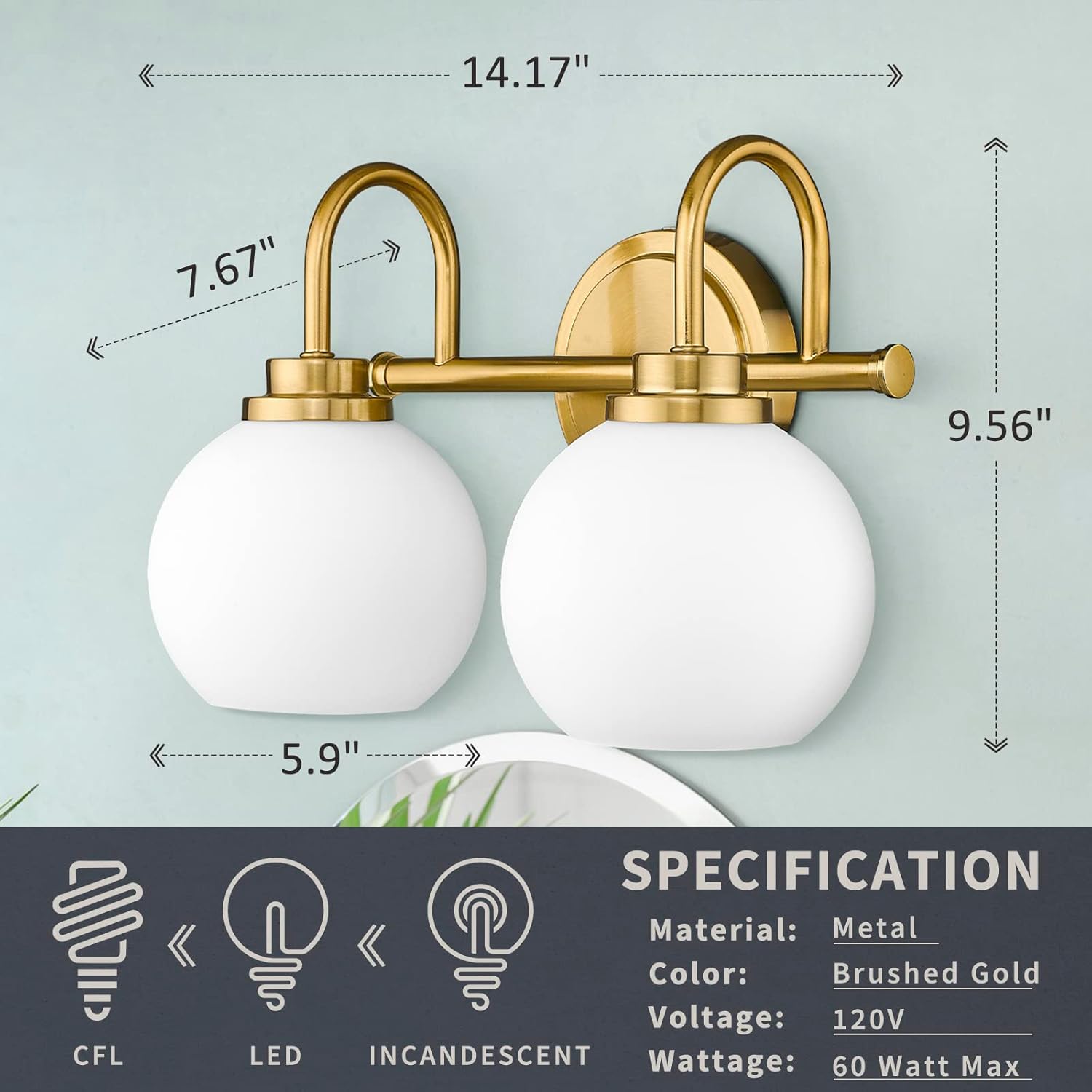 Gold Bathroom Vanity Light Fixtures, 2 Light Modern Over Mirror with White Milk White Globe Glass Shade